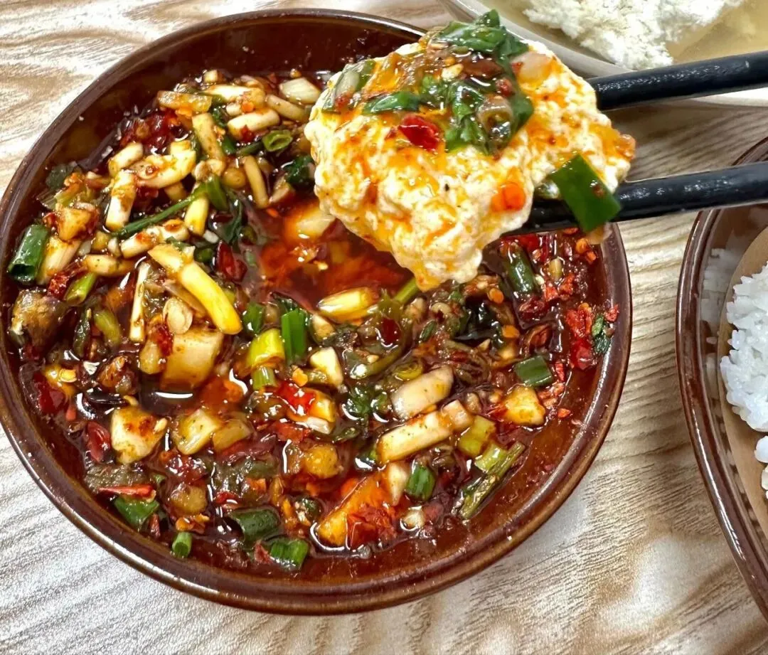 23、豆花饭:细嫩爽滑的豆花,搭配上香辣醇厚的蘸碟,随随便便就能吃两碗干饭,是老重庆人的最爱。