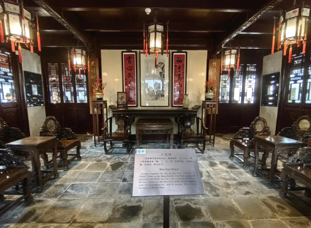 万花楼:楼两层,精雕细镂,造型美观。四周多回廊曲槛,三步一折,五步一弯,廊旁的白色粉墙边依墙缀以石峰,栽植翠竹。楼前栽有古树两株,右侧的银杏树高达14米,相传为潘允端的父亲潘恩种植,历400多年;左侧的广玉兰树龄100多年。楼南面的湖石假山,更是将自然之美发挥到了极致。