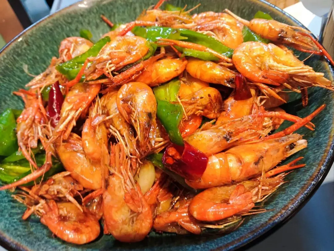 2、油爆河虾:选用鲜活河虾,高油温快速爆炒,虾壳酥脆,虾肉鲜嫩,酱汁包裹均匀。