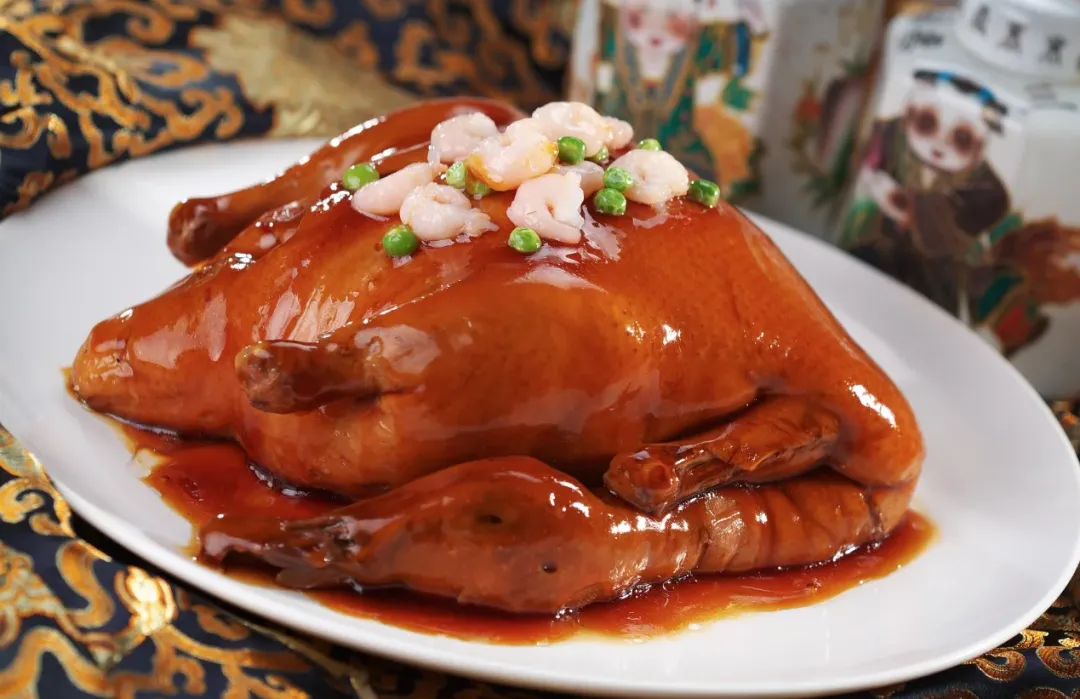 4、八宝鸭:整鸭去骨填入糯米、火腿、笋丁等八种食材,蒸制后鸭肉酥烂,馅料鲜香。