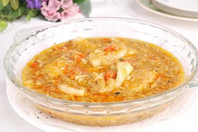 8、陈醋蟹粉鳕鱼冻:鳕鱼冻清澈透亮,蟹粉点缀其中,陈醋提鲜,口感清爽。