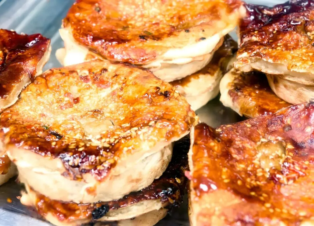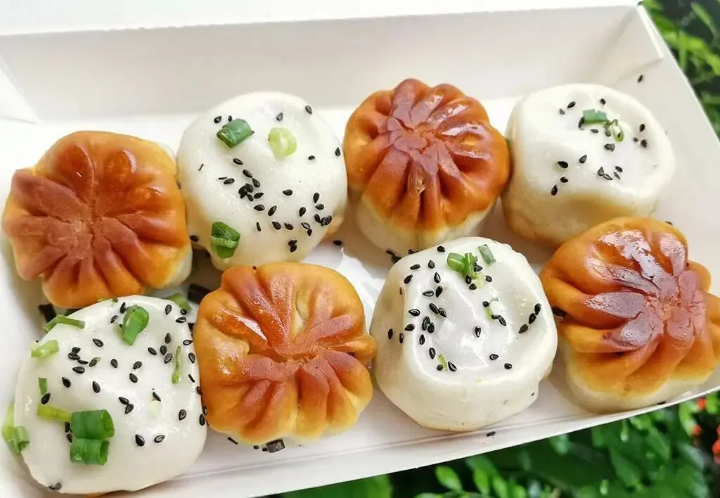 10、生煎包:发面皮包裹鲜肉馅,底部煎至金黄,撒芝麻葱花,先吸汤汁再吃馅,酥脆鲜香。