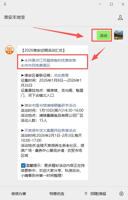 长按识别下方二维码,关注【淮安本地宝】,点击发消息,在聊天对话框发送“活动”,即可获取本次活动详情、2026淮安各景区活动、节日活动最新消息等信息。
