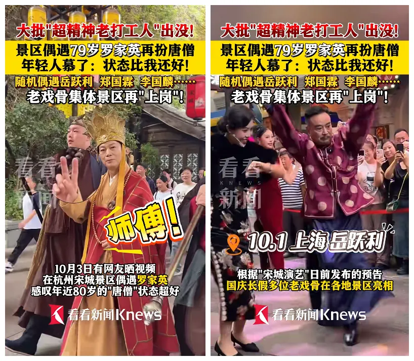 已过79岁的罗家英看起来状态不错 听到游客喊“师傅” 配合地比“耶” 不只是罗家英 国庆中秋假期 上海和广东等地的游客 陆续在景区“偶遇” 岳跃利、郑国霖、李国麟等 老戏骨们状态不错 热情互动让年轻网友直呼 “状态比我还好!”
