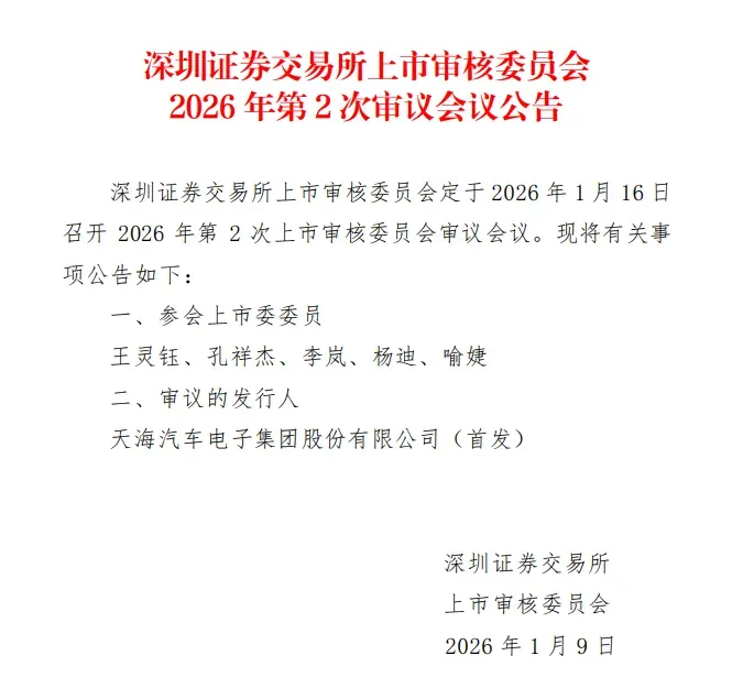 1月9日,深交所上市委公告,定于2026年1月16日召开2026年第2次上市审核委员会审议会议,审议天海汽车电子集团股份有限公司深交所主板首发事项。天海电子注册地址及办公地址均位于河南省鹤壁经济技术开发区,公司主要从事汽车线束、汽车连接器、汽车电子等汽车零部件产品的研发、生产和销售,在中国汽车线束行业的市场份额为8.45%,在汽车连接器行业的市场份额为3.52%。2024年,天海电子实现营收125.23亿元,归母净利润6.14亿元。2025年上半年,天海电子营收65.57亿元,归母净利润3.15亿元。(大河财立方)
