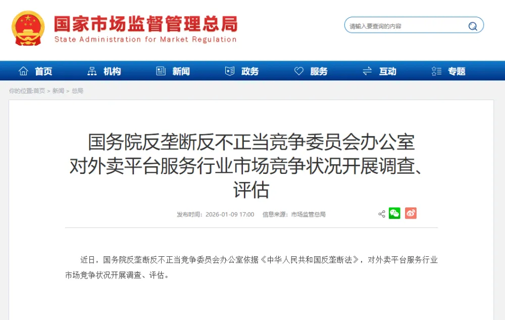 近日,外卖平台服务行业拼补贴、拼价格、控流量等问题突出,挤压实体经济,加剧行业“内卷式”竞争,社会各方面反映强烈。为此,国务院反垄断反不正当竞争委员会办公室,决定对外卖平台服务行业市场竞争状况开展调查、评估。👉详情(新华社)