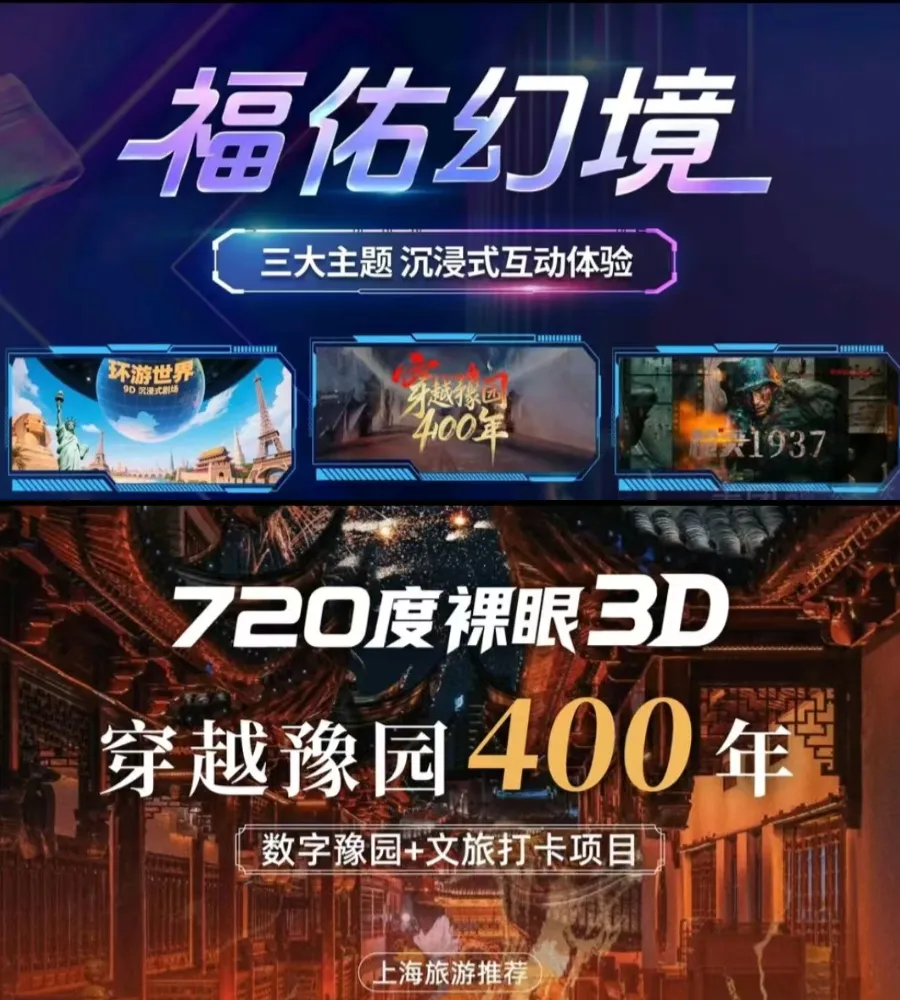 成人票【穿越豫园】+【环游世界】¥68室内 4000㎡、室外露台 1500㎡,主打上海近代史与豫园文化《穿越百年、豫见上海》沉浸式主题乐园。
