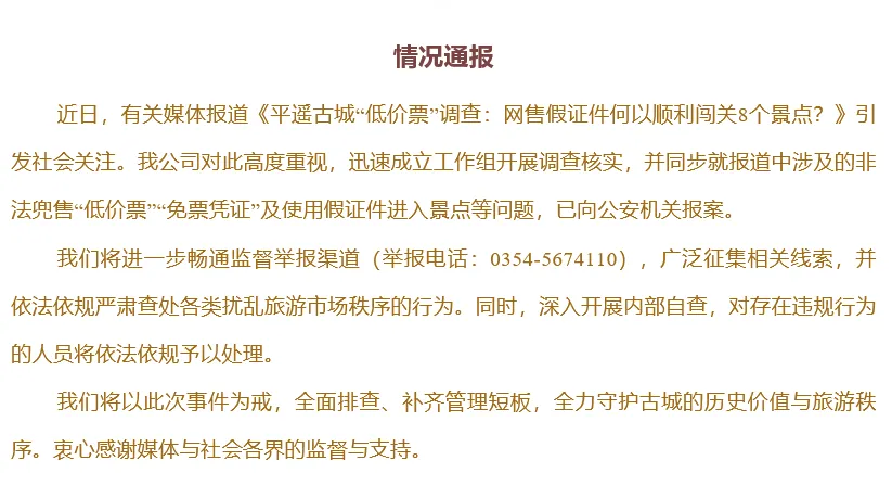 近日,有关媒体报道《平遥古城“低价票”调查:网售假证件何以顺利闯关8个景点?》引发社会关注。我公司对此高度重视,迅速成立工作组开展调查核实,并同步就报道中涉及的非法兜售“低价票”、“免票凭证”及使用假证件进入景点等问题,已向公安机关报案。