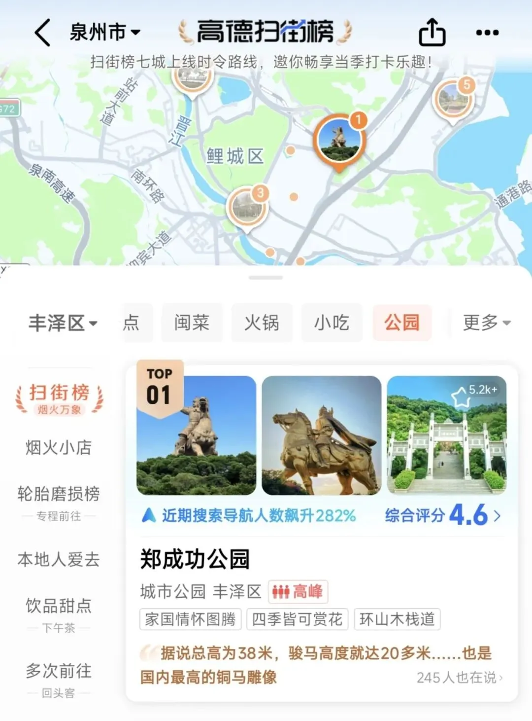 马年“马上成功”景点火了!年轻人扎堆走上“成功路”很多人可能没想到,2026年开年,在一众热门目的地中,第一个脱颖而出的爆款景点,是福建泉州的郑成功公园。 公园里那座气势恢宏的“郑成功骑马铜像”,因与“马上成功”的美好寓意完美契合,一跃成为年轻人争相打卡的“新年接好运第一站”,登上了微博热搜。 高德扫街榜数据显示,元旦期间,郑成功公园搜索导航人数飙升了282%,强势登顶泉州飙升榜第一名!