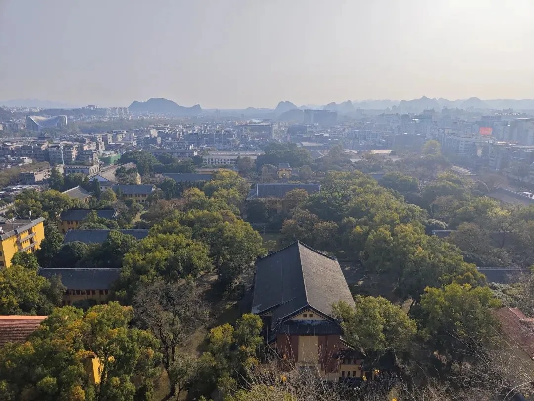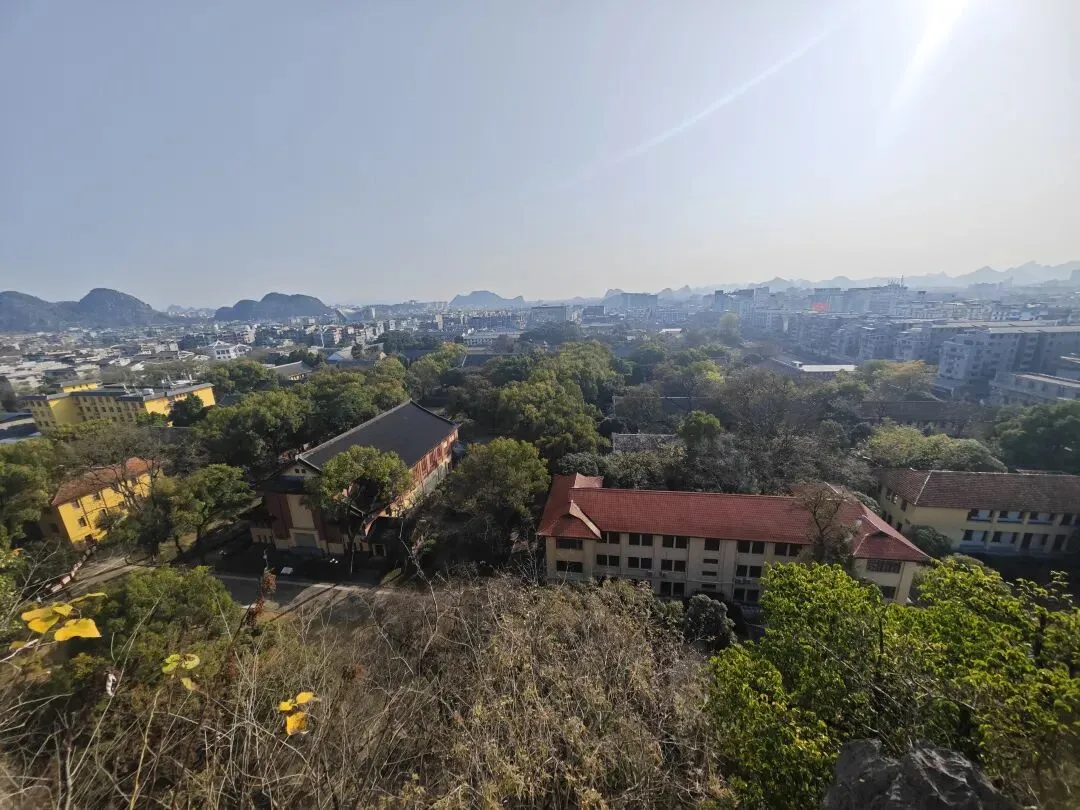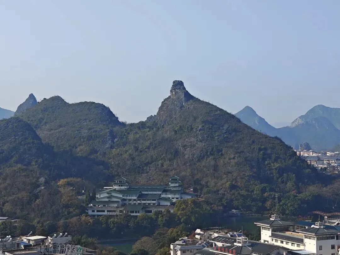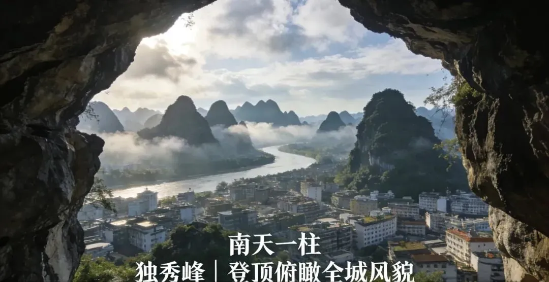 素有“南天一柱”美誉的独秀峰,平地拔起、孤峰独秀,傲然矗立在景区中央。登顶的石阶虽不算陡峭,却步步藏着惊喜,沿途摩崖石刻斑驳,留存着历代文人墨客的题咏。待攀上峰顶,一幅震撼的画卷便在眼前铺展:桂林全城风貌尽收眼底,错落的城市建筑与远处层峦叠嶂的峰林相映成趣,晴日里可见漓江如练,烟雨时则云雾缭绕,山水与城郭的和谐之美,在此刻展现得淋漓尽致。