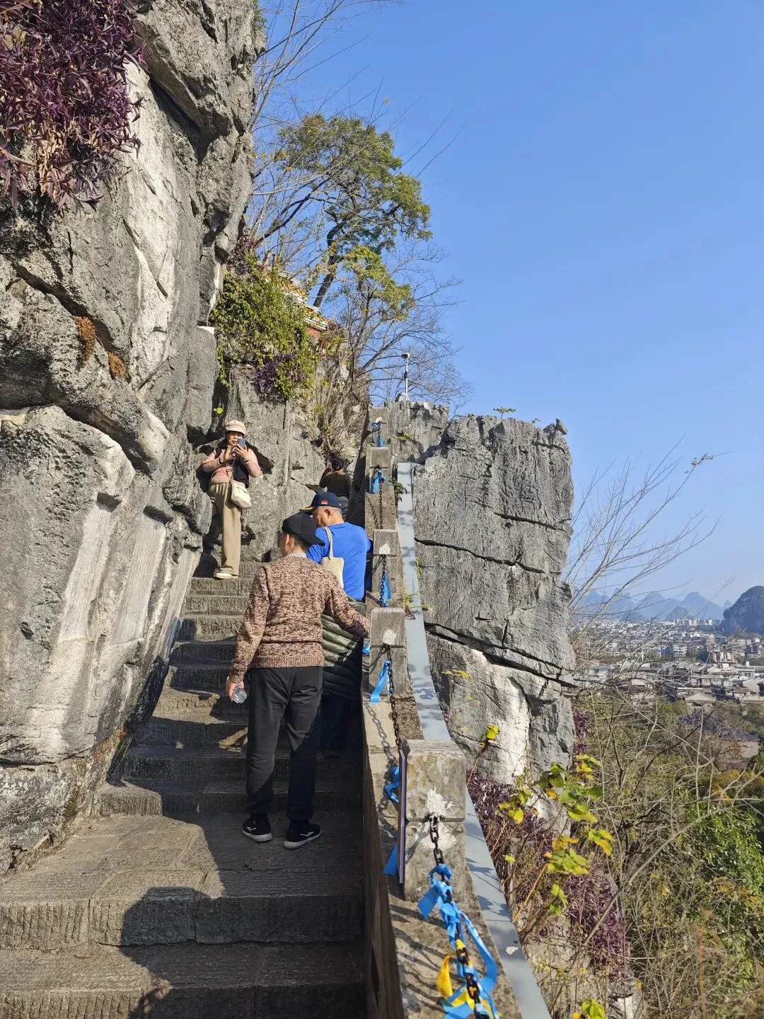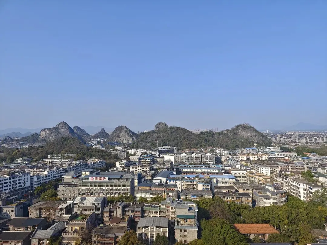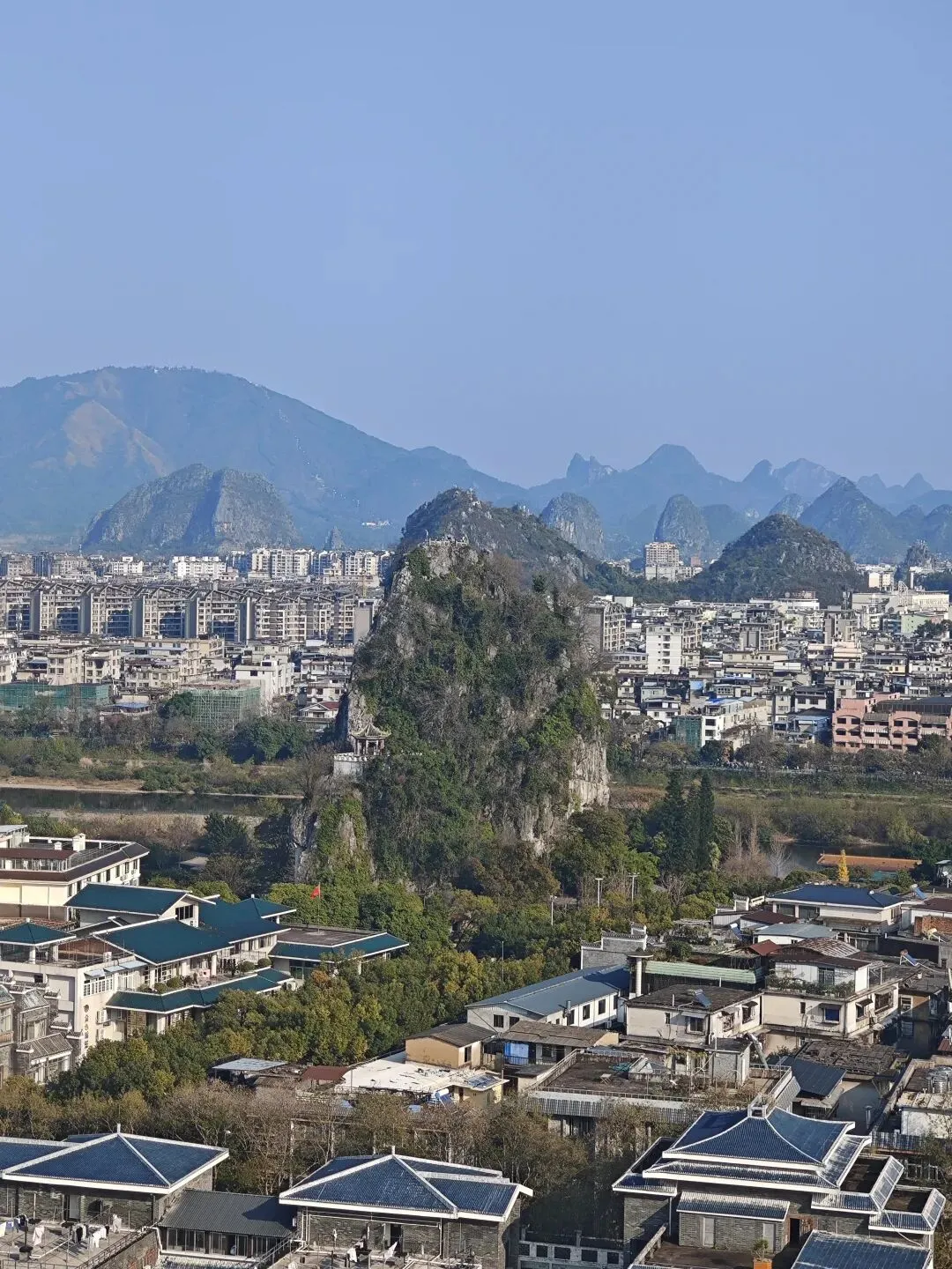 素有“南天一柱”美誉的独秀峰,平地拔起、孤峰独秀,傲然矗立在景区中央。登顶的石阶虽不算陡峭,却步步藏着惊喜,沿途摩崖石刻斑驳,留存着历代文人墨客的题咏。待攀上峰顶,一幅震撼的画卷便在眼前铺展:桂林全城风貌尽收眼底,错落的城市建筑与远处层峦叠嶂的峰林相映成趣,晴日里可见漓江如练,烟雨时则云雾缭绕,山水与城郭的和谐之美,在此刻展现得淋漓尽致。