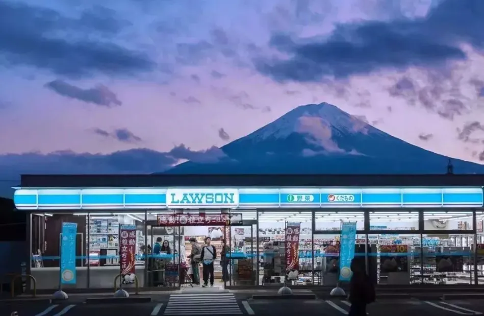 远处是富士山,近处是灯火通明的罗森便利店。两者掩映对比,形成了风靡SNS社区的网红景点,吸引了包括本地及世界各地的游客前来打卡。