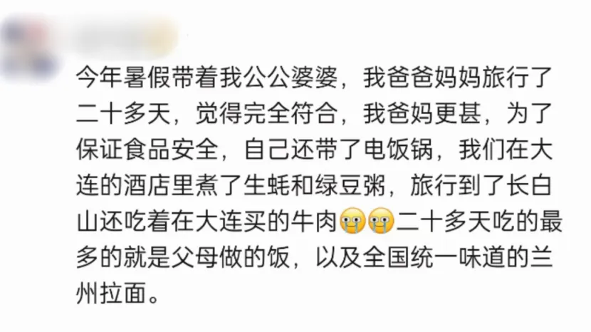当然,虽然有省钱的因素在,但父母还是更多想让一家人吃得安心,或是担心“外面的饭不干净”影响孩子身体,或是担心外地的饭不合孙子孙女口味。 年轻人带爸妈出门旅游,爱是密密麻麻的攻略。 而父母跟着孩子出门旅游,爱是沉甸甸的包裹。