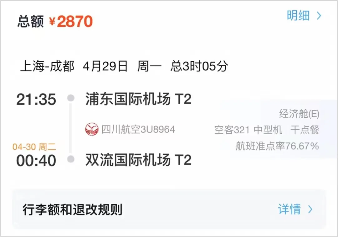 首先让人惊掉下巴的,就是机票大跳水 不知道大家这个五一有没有遭遇机票刺客 机票跳水不是新闻,但一次性跳这么多,确实让人恼火 上海到成都的机票,同一航班,我朋友提前预定的票价是2870元/人
