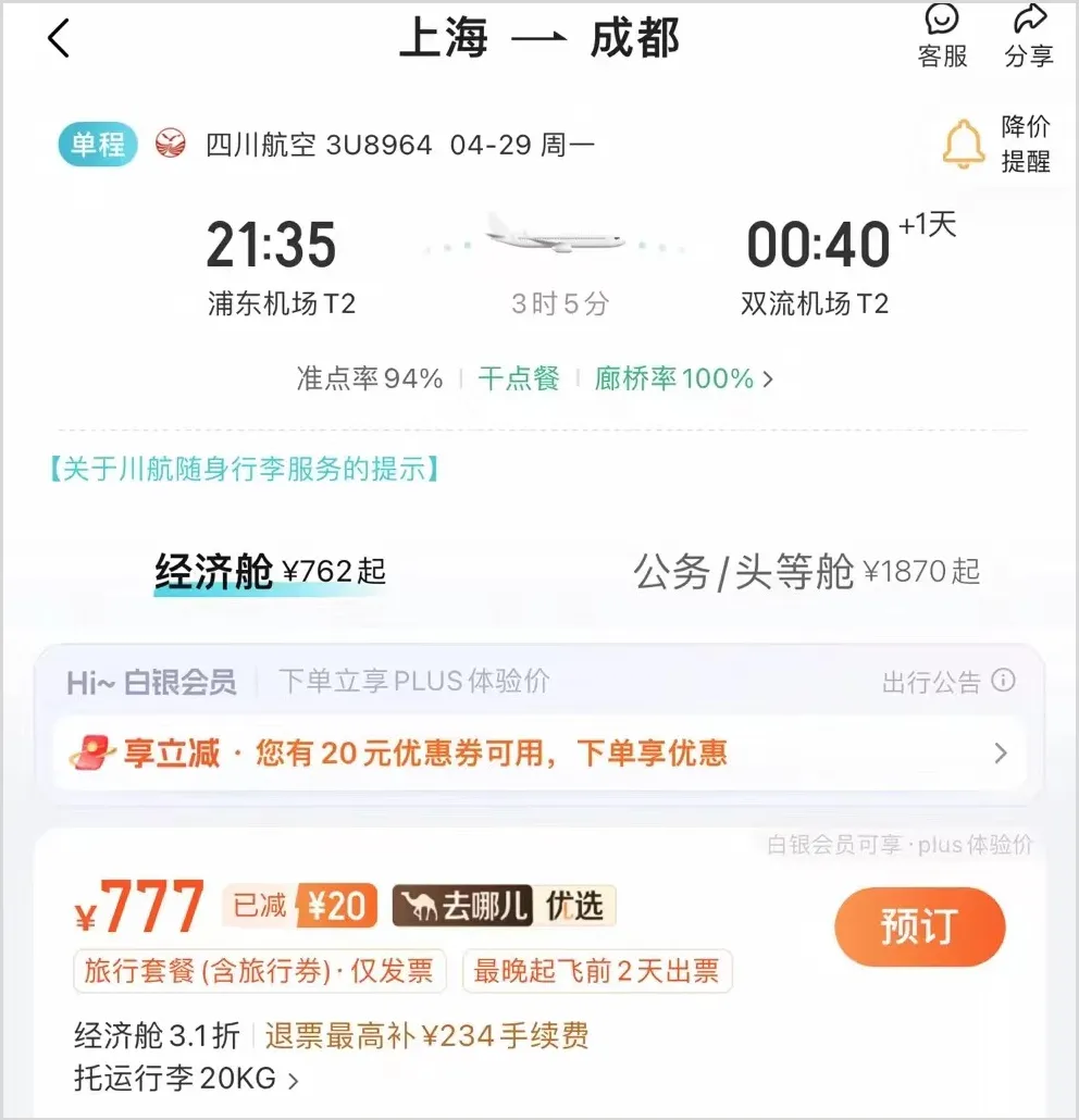 临近五一,票价突然变成777元/人,直接差了4位数 相当于全款买了一件衣服,付款后就发现,这件衣服突然打了2.7折