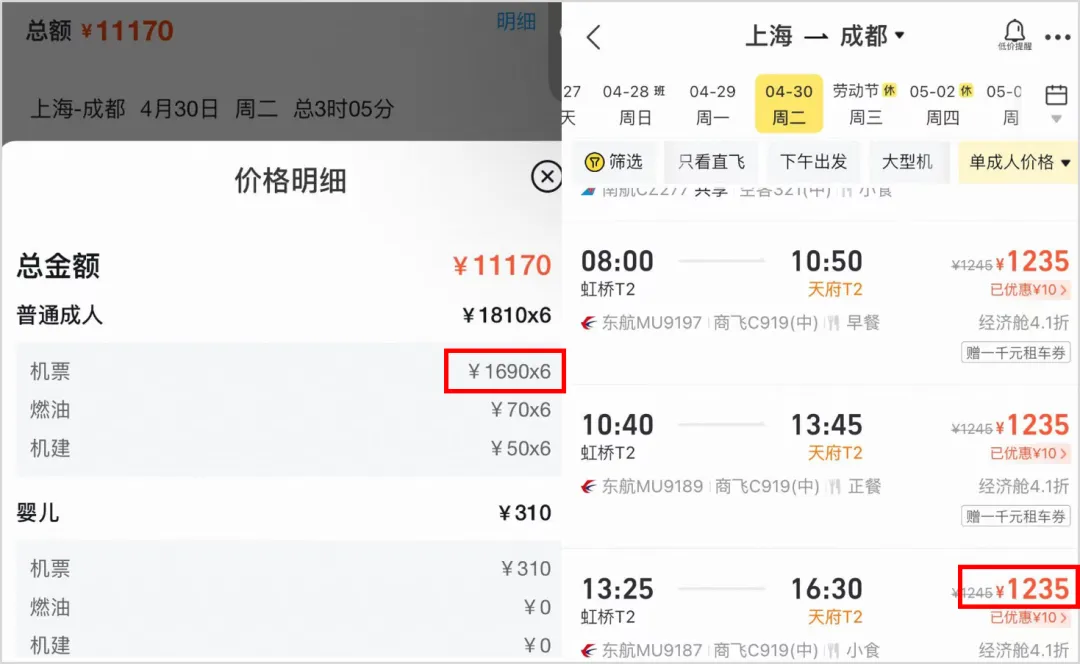 不过我另外一个朋友更加是个倒霉蛋 她五一期间举办婚礼,所以提前为亲戚预定了上万块的机票 单价1690元/人,结果前两天再看的时候,票价已经变成了1235元/人
