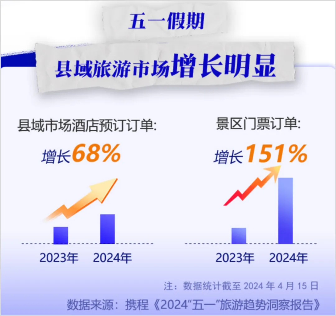 数据来源:航旅纵横、携程、飞猪 根据同程旅行平台数据,今年4月29日、30日到达三线及以下城市(含县级城市)的火车票和机票的热度,周环比上升200%以上 小城闲游的松弛度假模式明显更受欢迎 而且,携程《2024“五一”旅游趋势洞察报告》显示,截至2024年4月15日,五一假期县域市场酒店预订订单同比增长68%、景区门票订单同比增长151%,增速高于全国大盘