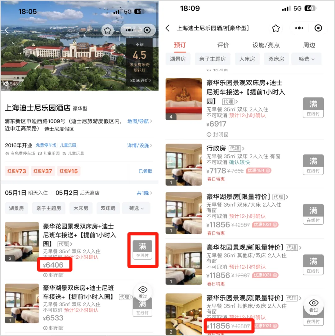 北京、上海、三亚这样常规的旅游城市,无论是出行成本还是住宿成本,真的是太高了 一晚上住宿费就高达6406-11856元不等(就这价格,还好意思说是“春日特惠”) 价格奇高还不算,关键是竟然抢不到,各个房型还都订满了
