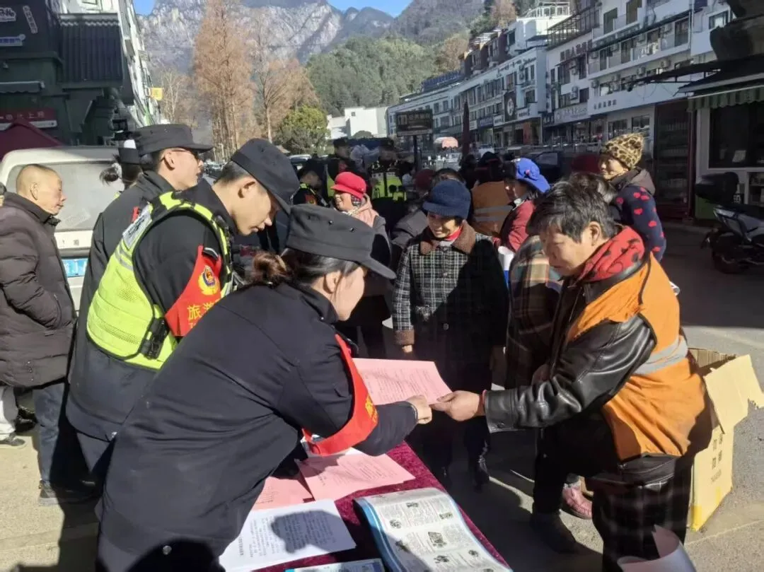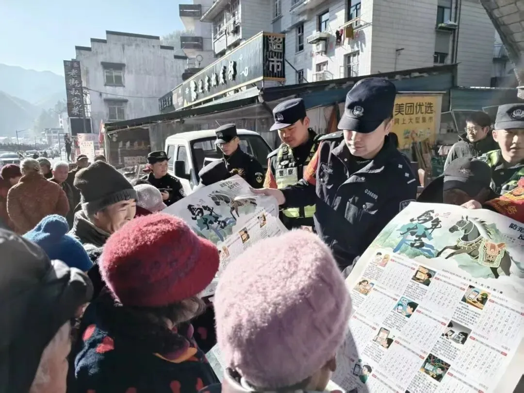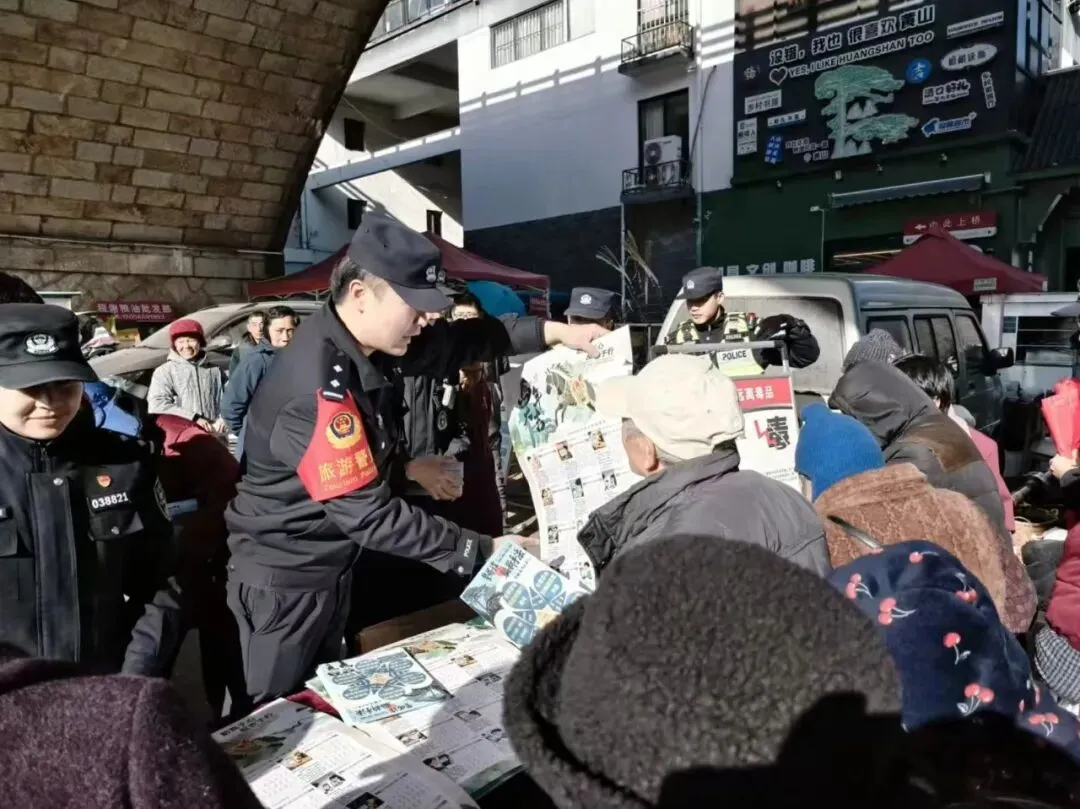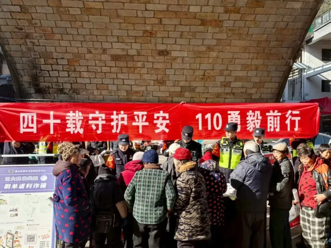 心系群众安危事,平安宣传零距离。黄山风景区公安局以警察节为契机,开展“四十载守护平安 110勇毅前行”主题宣传日活动,把安全知识送到游客和群众身边。活动现场,民警通过摆放宣传展板、发放宣传手册等形式,结合典型案例讲解电信网络诈骗常见手段、景区治安防范要点。同时,为群众送上印有安全提示的挂历、抽纸等小礼品,用接地气的方式提升宣传实效,引导大家提高安全防范意识,共同织密景区安全防护网。