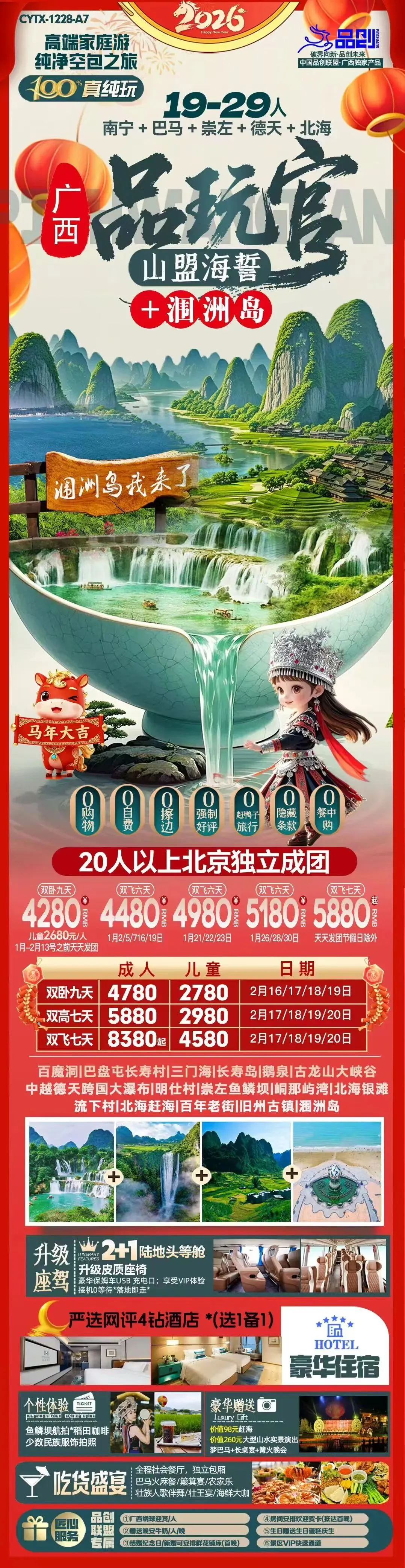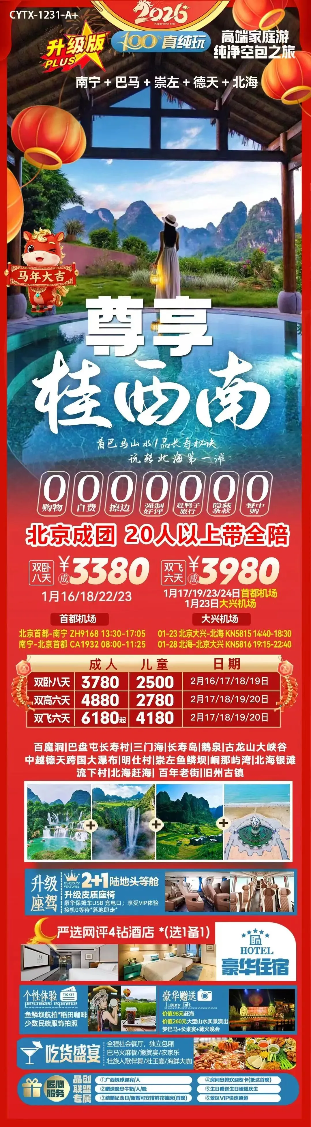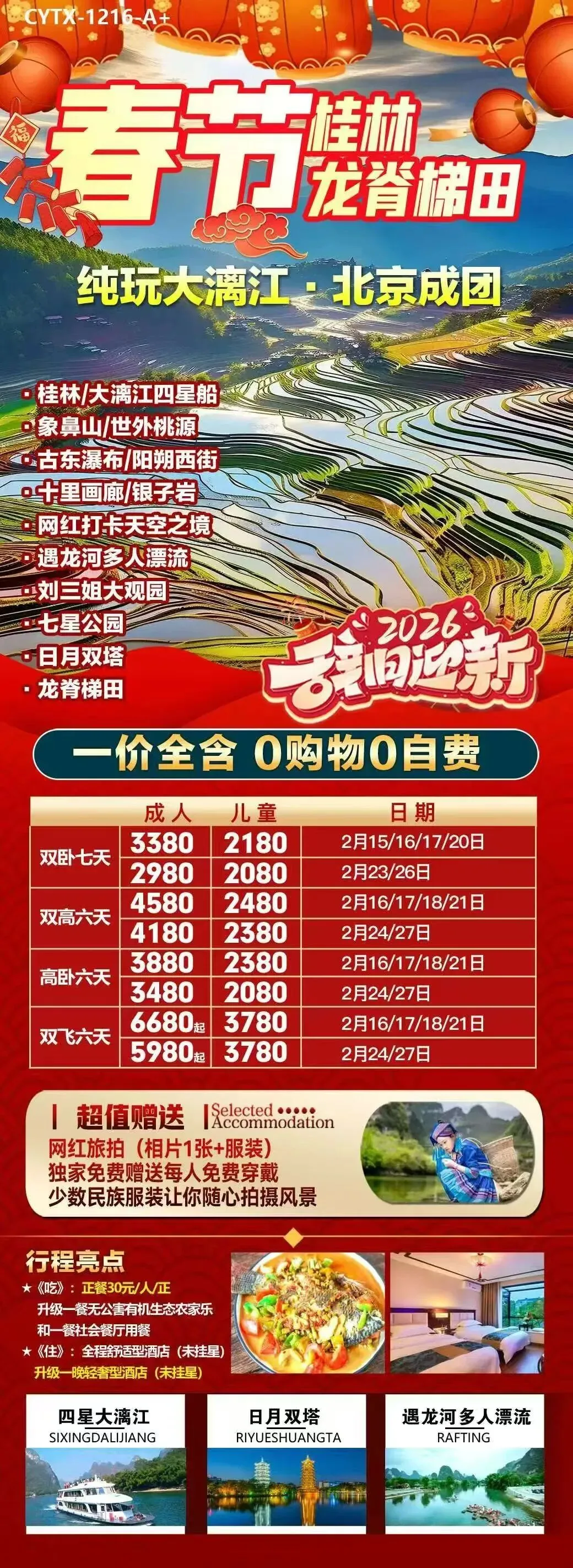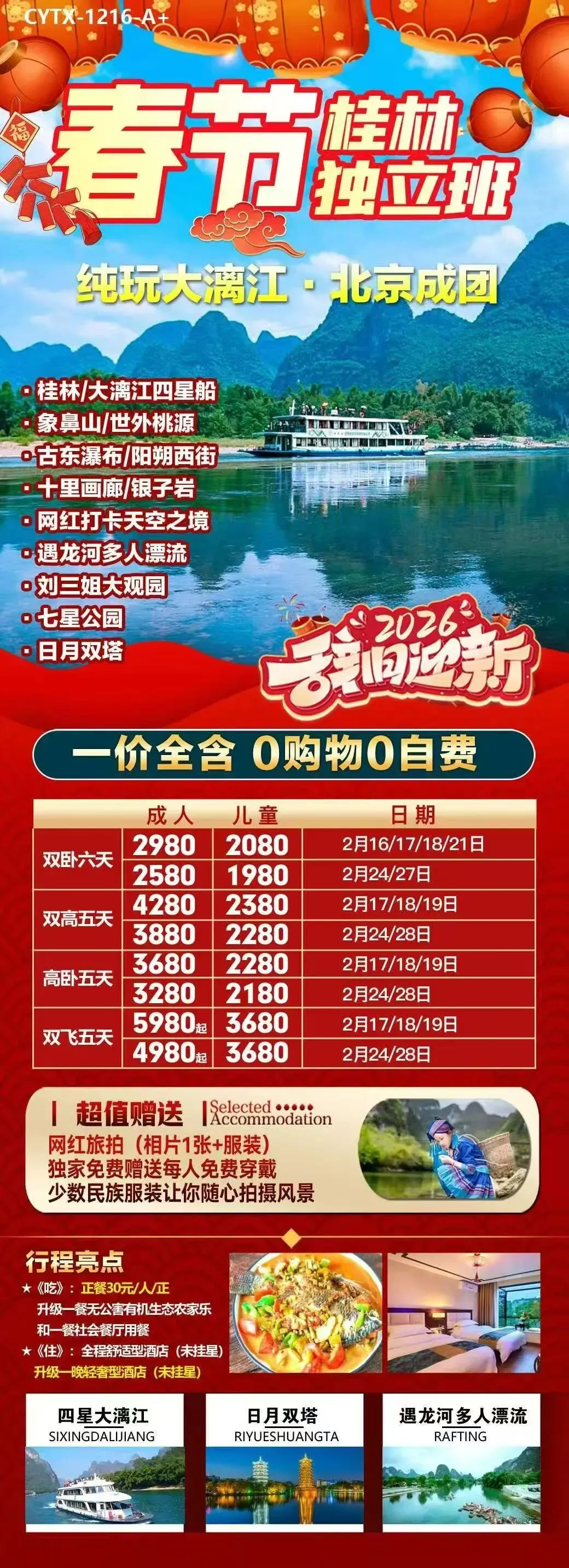 【2026春节·桂林独立班】 ❤️ 北京成团·纯玩无忧:0自费0购物 🎉 精华景点一网打尽: 桂林市标志:象鼻山 山水秘境:古东瀑布、世外桃源 阳朔风情:西街夜游、遇龙河竹筏漂流 地质奇观:银子岩 文化体验:刘三姐大观园、日月双塔、七星公园 📸 网红旅拍:专业摄影师捕捉漓江最美时刻,留下春节独家记忆 🚢 四星船豪华游轮:舒适舱位,全景视野,尽享大漓江水墨画卷 🏨 舒适住宿:全程舒适型酒店,升级一晚轻奢型酒店,让旅途更添温馨 🍽️ 舌尖盛宴: 社会餐厅:品味地道桂菜 无公害有机农家乐:新鲜食材,田园风味 四星船船餐:特色美食,江景相伴