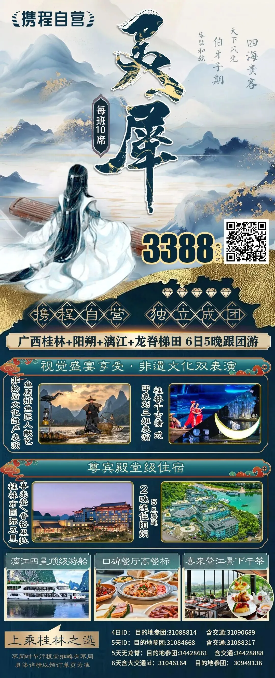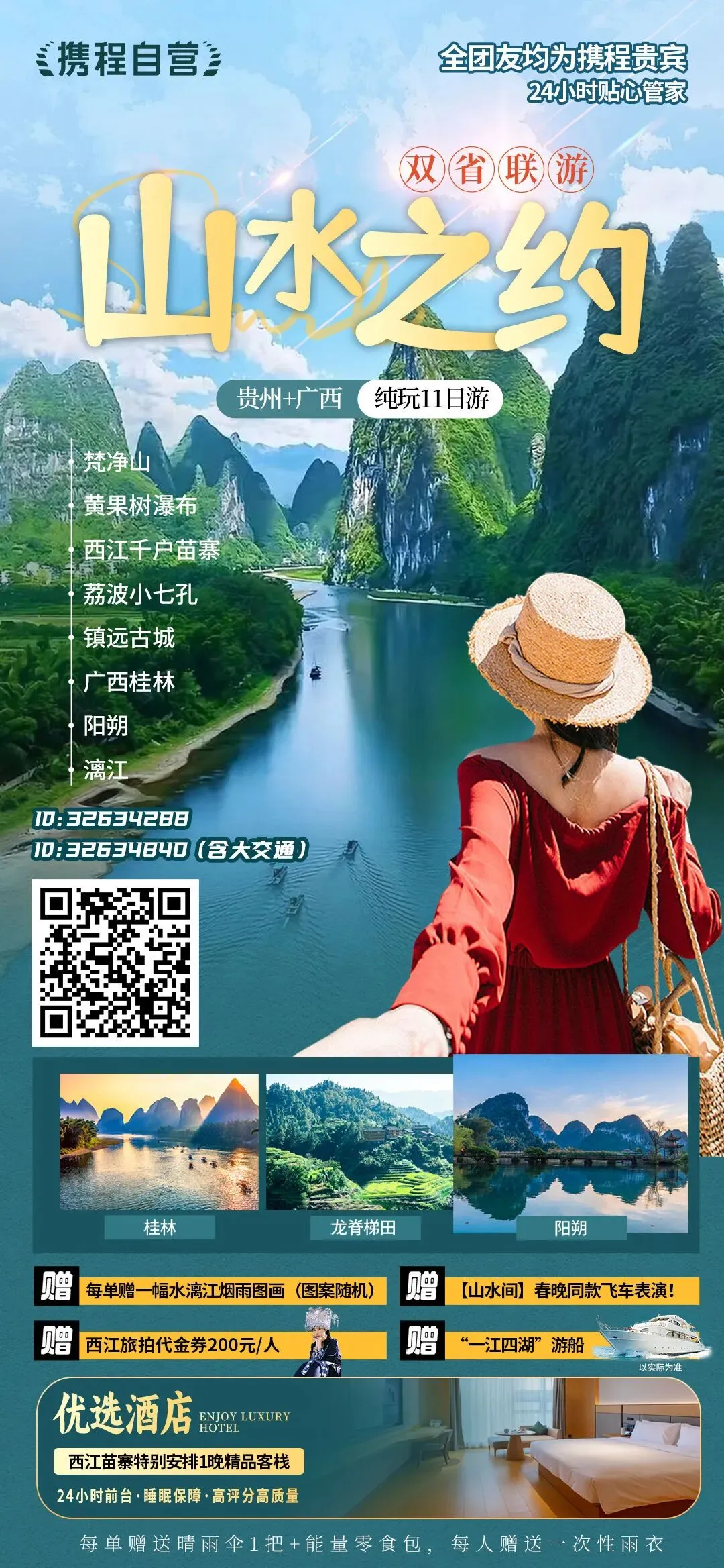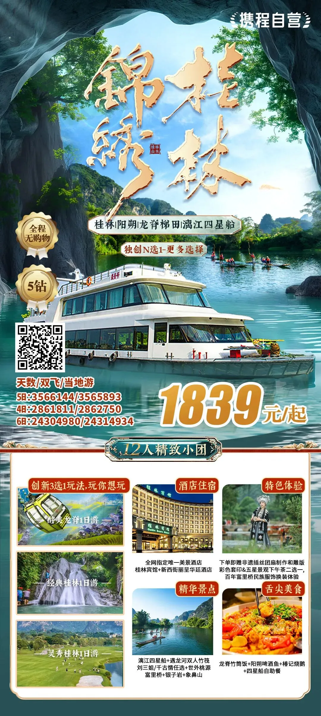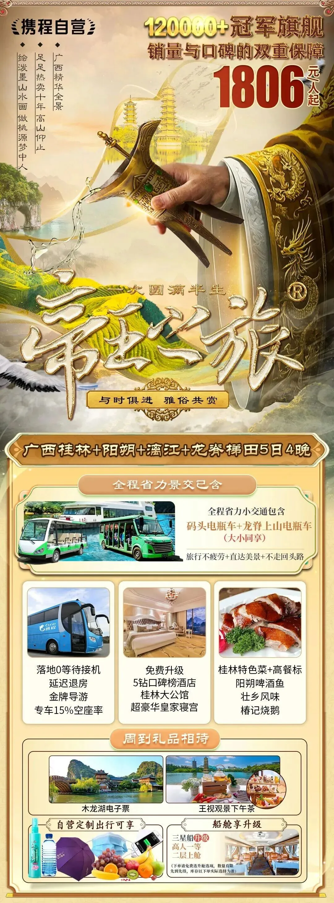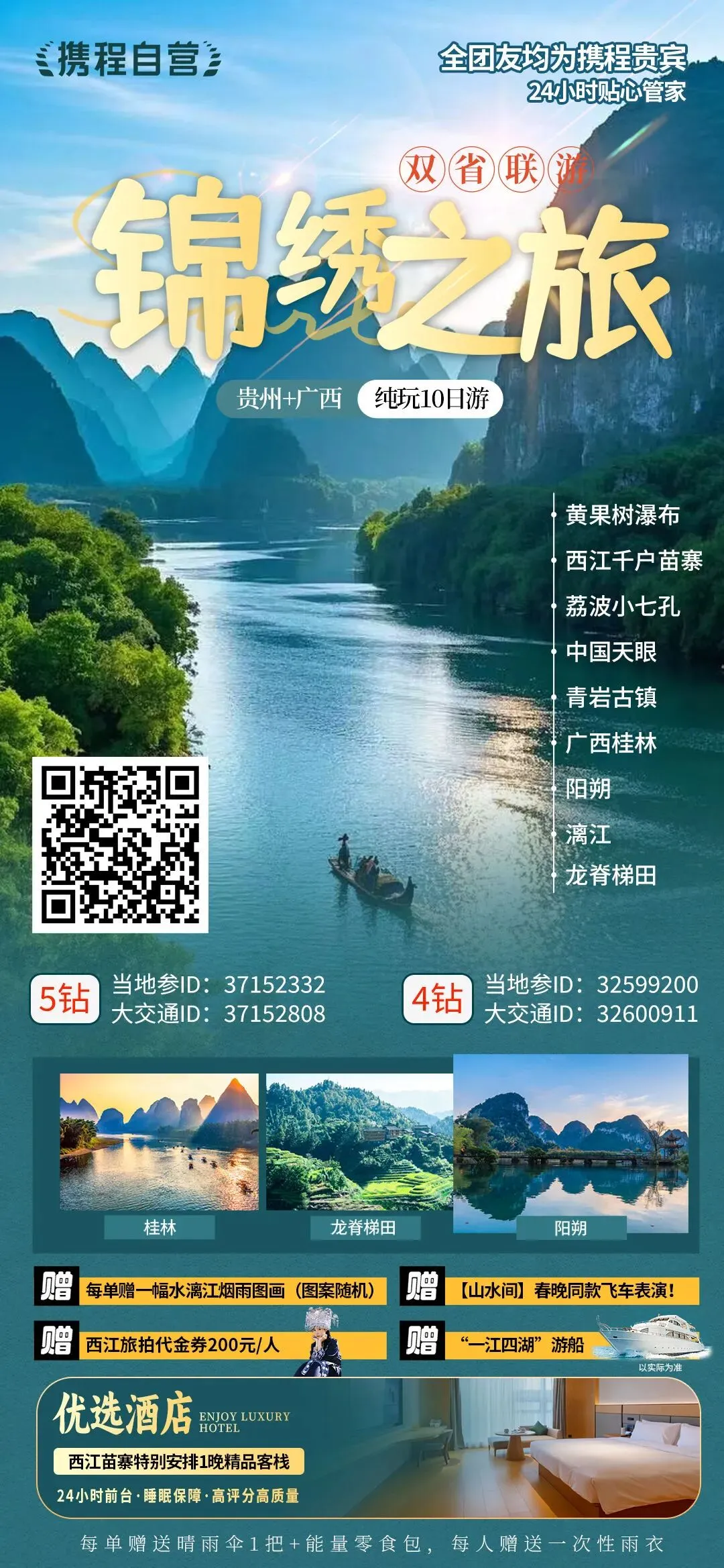 【大牌驾到】珍稀席位 限量争藏自营品质旗舰+金牌导游10人团,限量0元升四星船商务/头等/上舱+有市无价【度假首选】携手珍贵 共涉珍稀2表演+2非遗+2换装+赠景交+航拍,金典美景+门票更贵 经典美食+餐标更高【尊享入住】极核奢宅 世界作品五星香格里拉/喜来登+2晚阳朔地标五星酒店奢驿连住 西街步行3分钟