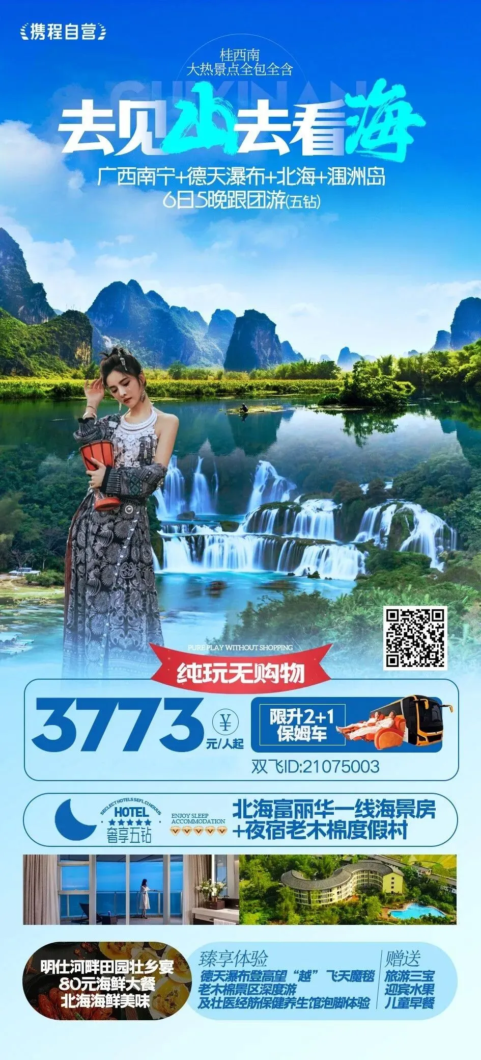 【崇左深度游】竹筏明仕田园+德天跨国瀑布+北海畅游+浪漫涠洲岛,亲子赠海洋之窗