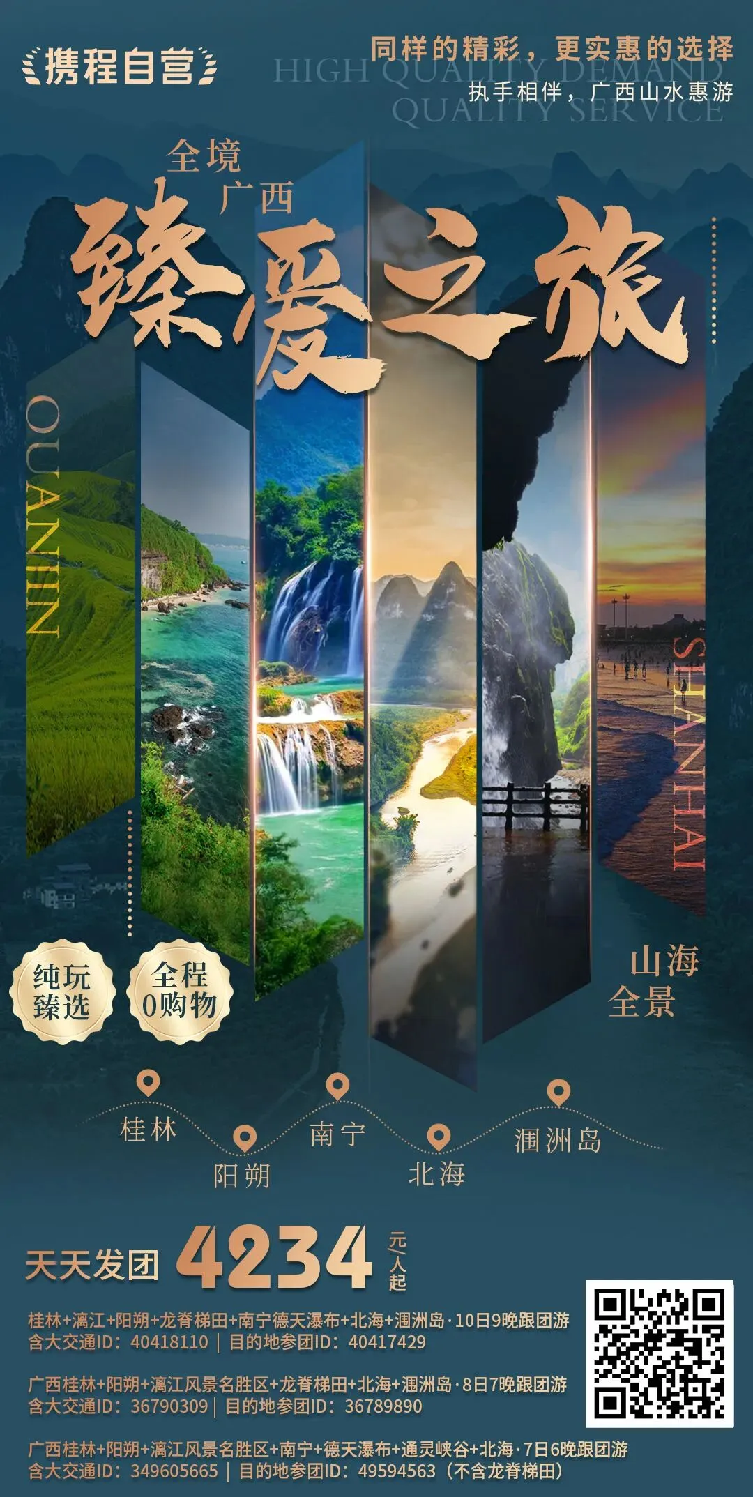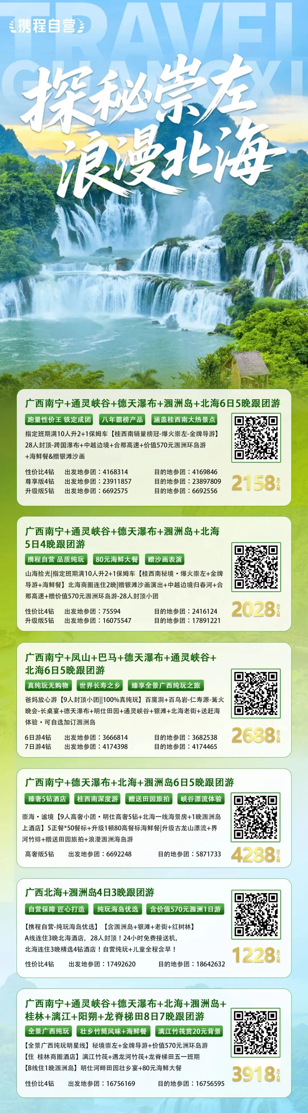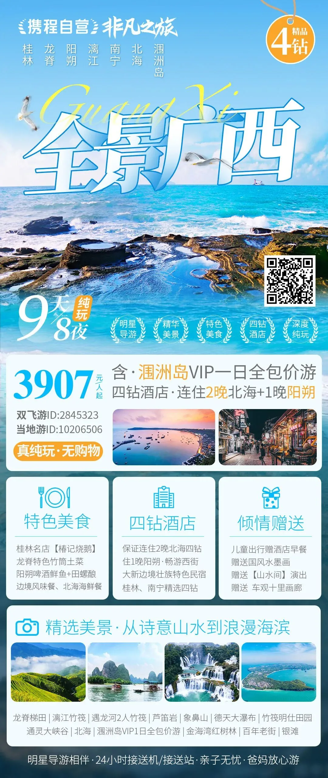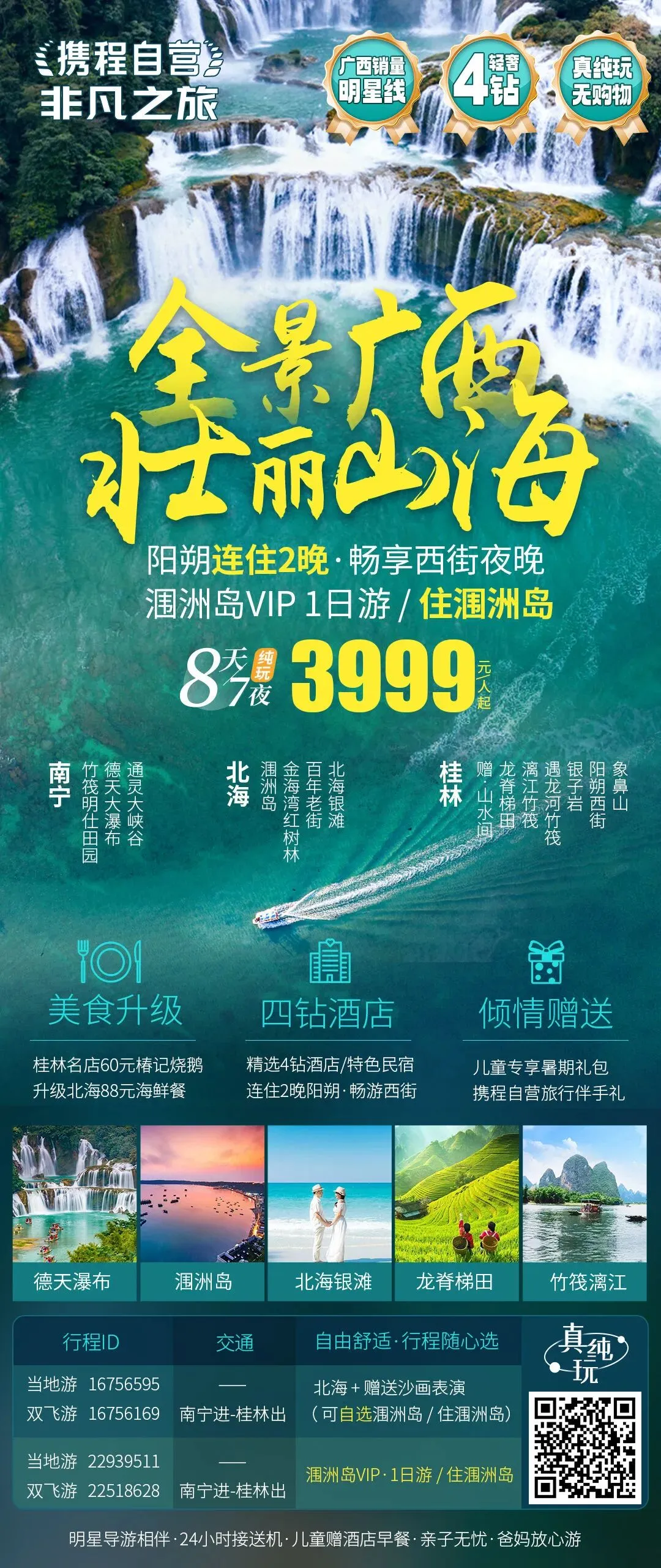 #广西南宁+通灵峡谷+德天瀑布+北海+涠洲岛+桂林+漓江+阳朔+龙脊梯田8日7晚跟团游(4钻)