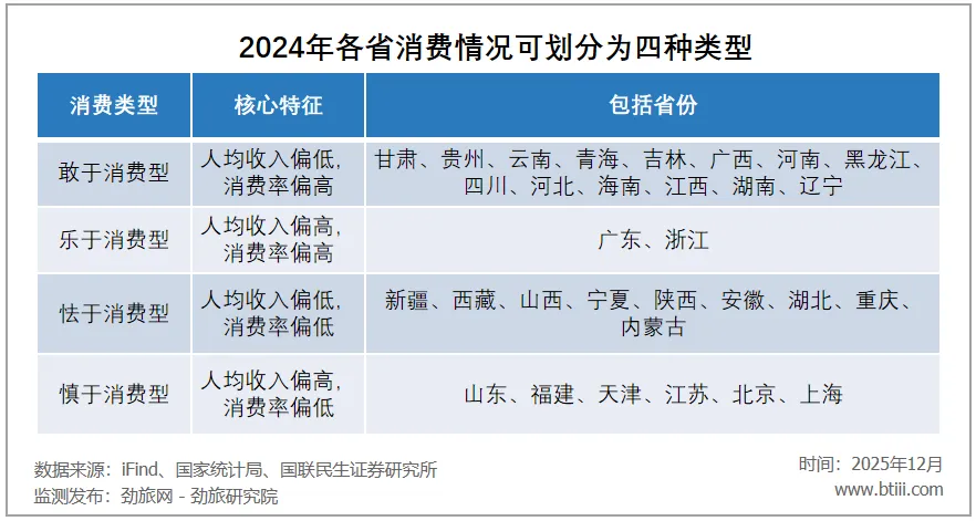 劲旅君日前看到一份国联民生证券研究所的报告,该报告根据各省人均消费率及人均可支配收入数据,把各省划分为四种消费类型,如下图: