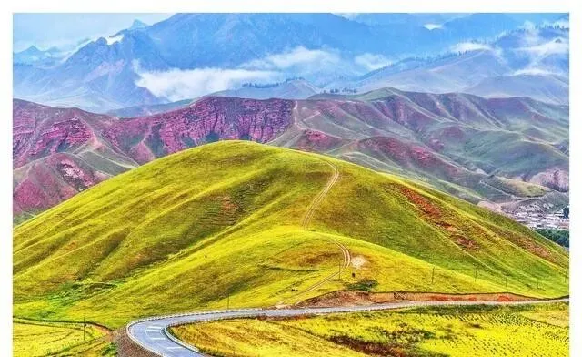 山是红的 , 丹霞地貌。 山脚黄色油菜花 , 山腰绿色草场 , 山脊红色砂岩 , 色彩层次太丰富了!