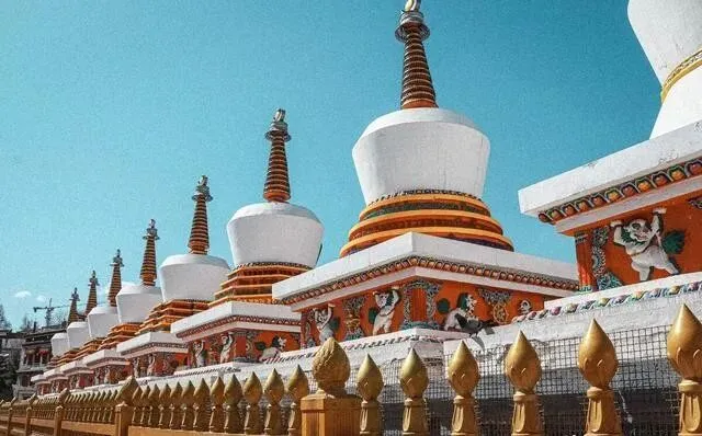 酥油花、壁画、堆绣是塔尔寺三绝 , 酥油花还是世界非遗 , 有专门展馆。 入口右边八座白塔叫八宝如意塔 , 一直有人绕着虔诚参拜~