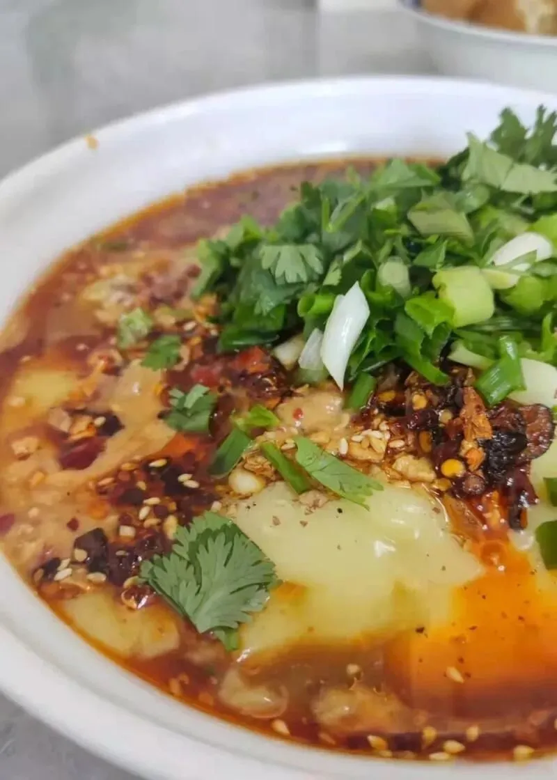 当地人吃法野:先撒一层油辣子,再来点芝麻,花椒面,酸菜碎。筷子搅拌,把底下的饵丝翻上来,裹满豆粉。嗦一口,滑的,糯的,麻的,辣的,嘴唇粘着豆粉的颗粒感。早上6点,街边摊子前蹲一排人,呼噜呼噜吸的满头汗,5块钱管饱,吃完嘴角都是绿的。