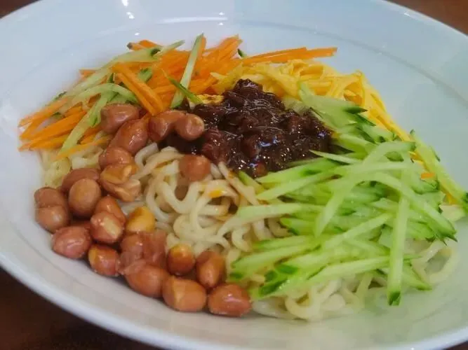 炸酱面,日本人的心头好。手擀面条筋道,咬下去弹牙。肉丁炸酱黑亮黑亮的,豆瓣酱熬出来的焦香味儿直往鼻子里钻。黄瓜丝、心里美萝卜丝、水萝卜丝、黄豆、芹菜丁,七八个小碟子码一圈儿。吃的时候往碗里一扣,筷子搅合搅合,面条�的满满都是酱。嗦一大口,酱香咸鲜,嚼着嚼着满嘴都是肉粒儿。15块钱一碗,管饱,吃完了用面汤溜溜缝。这是烤鸭给不了的踏实。