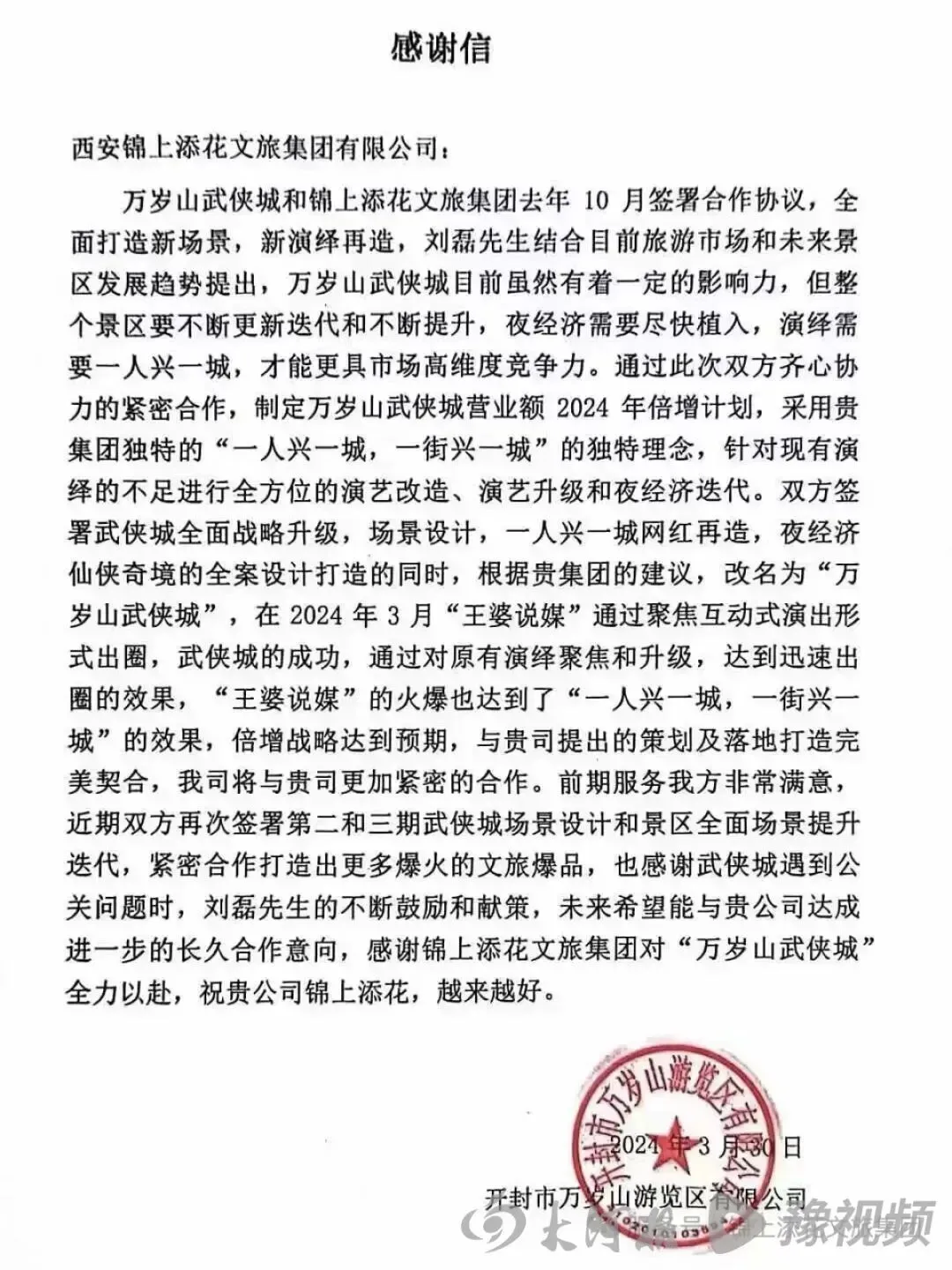 锦上添花率先发力,推动景区将“万岁山·大宋武侠城”简化为“万岁山武侠城”,凭借“零成本出圈”的改名营销打响第一枪;随后打造的“仙侠奇境”夜经济片区,以及现象级互动IP“王婆说媒”,让景区热度指数级飙升。2024年3月,万岁山特意发来感谢信,明确认可“王婆说媒”的爆火与锦上添花的策划落地“完美契合”,同年4月更特聘锦上添花董事长刘磊为高级顾问,彼时的“文旅CP”可谓蜜里调油。