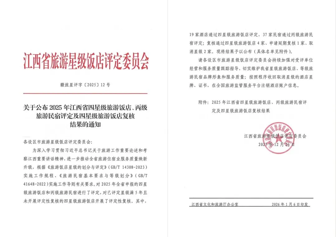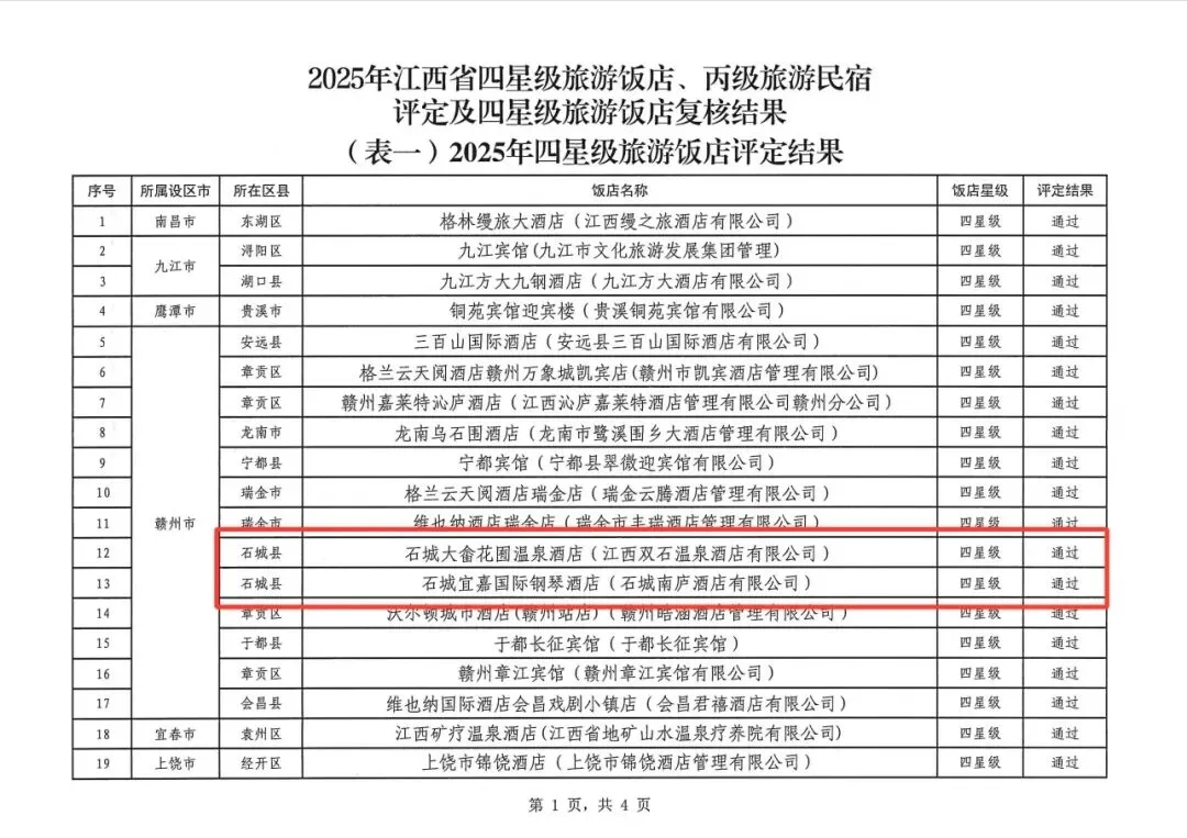根据《关于公布2025年江西省四星级旅游饭店、丙级旅游民宿评定及四星级旅游饭店复核结果的通知》,石城大畲花囿温泉酒店、石城宜嘉国际钢琴酒店顺利通过四星级旅游饭店评定。