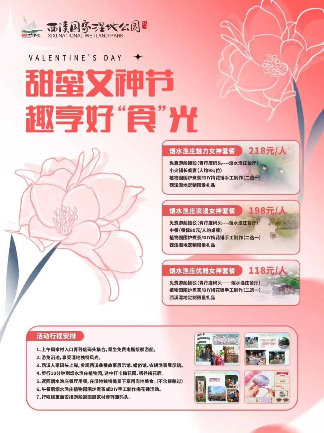 优惠政策:游船+小火车套票38元/位(前100名女性游客乘坐游船赠送康乃馨一束)