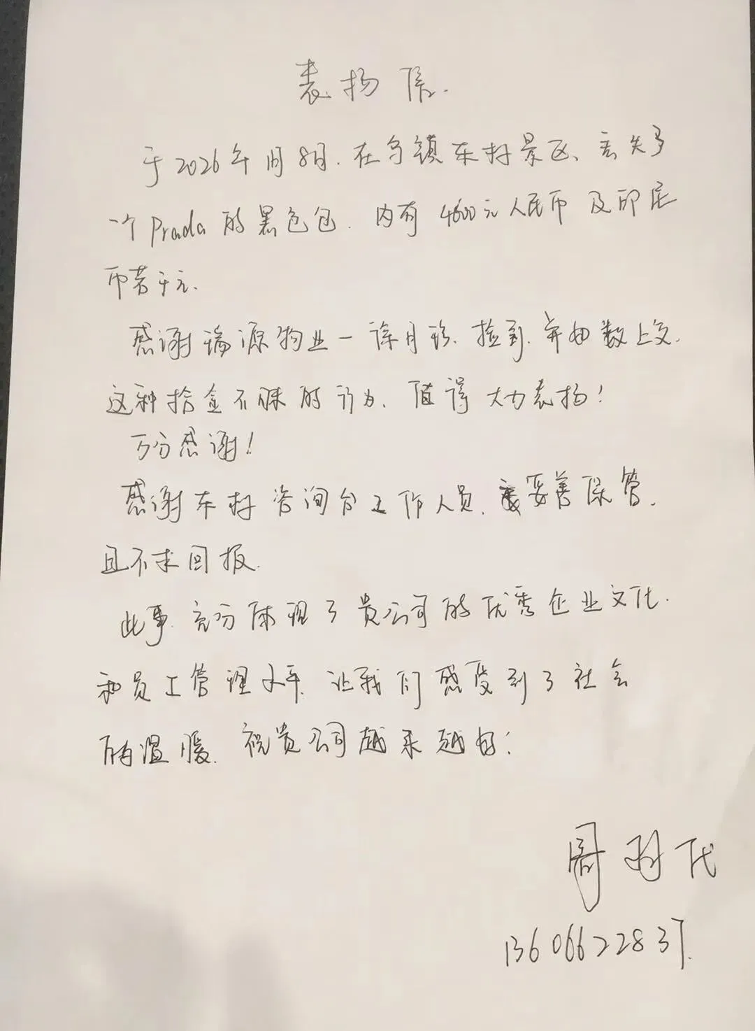 失主周先生闻讯赶来,核对物品无误后,感动不已,特意手写了一封情真意切的表扬信,向保洁员徐月珍及乌镇景区的工作人员表达了诚挚谢意。信中,周先生特别写道:“这种拾金不昧的行动,值得大力表扬!这件事让我深深感受到了优秀的企业文化与员工管理水平,也让我体会到了社会的温暖。”字里行间,既有对传统美德的礼赞,更饱含着对现代物业服务的深切期许。