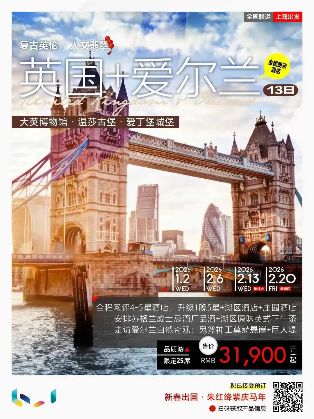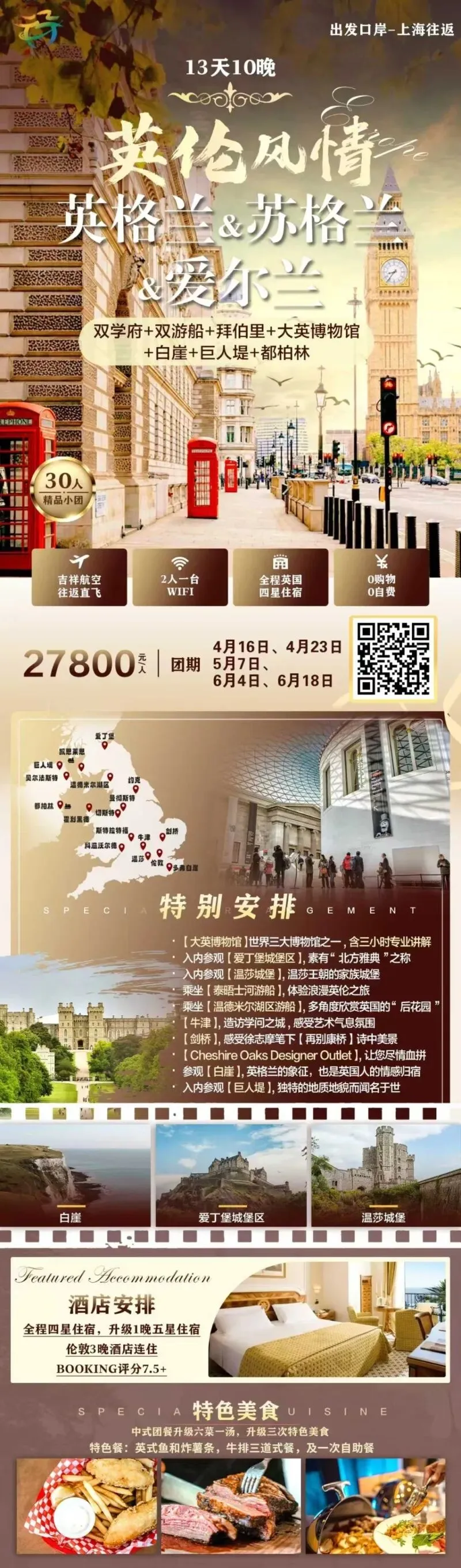 【🇬🇧🇮🇪YA1-英国+爱尔兰★推一罚十★白崖+巨人堤】13天10晚,27800元/人