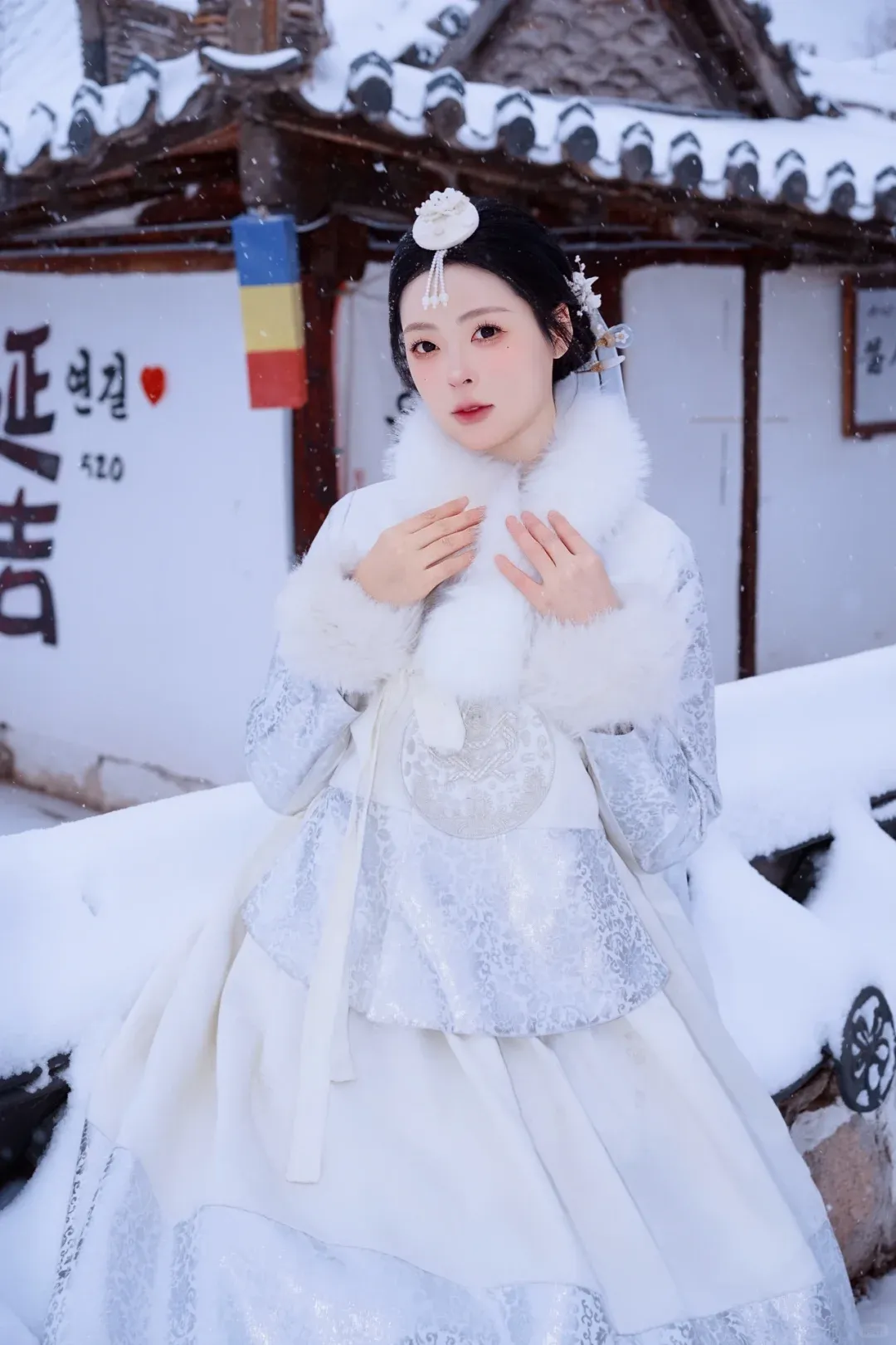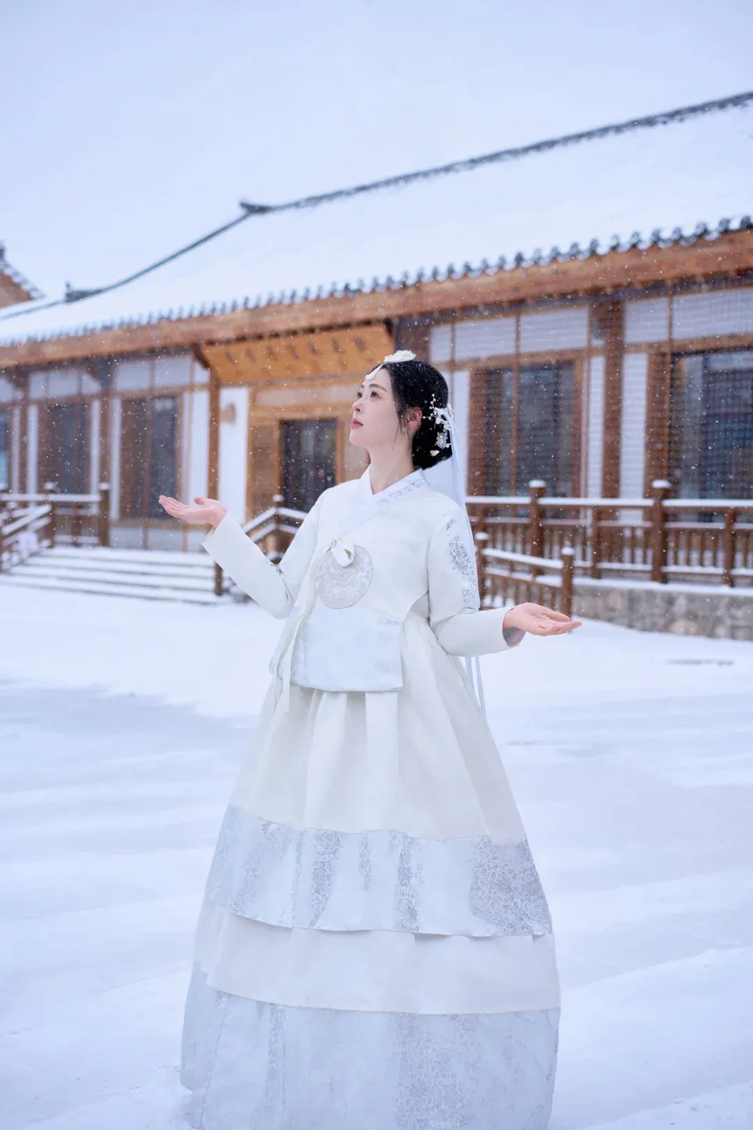 身着朝鲜族传统服饰的人们,在中国朝鲜族民俗园中漫步,鲜艳的服装、古朴的屋舍与洁白的雪景相互交融,构成了一道独特的风景线。