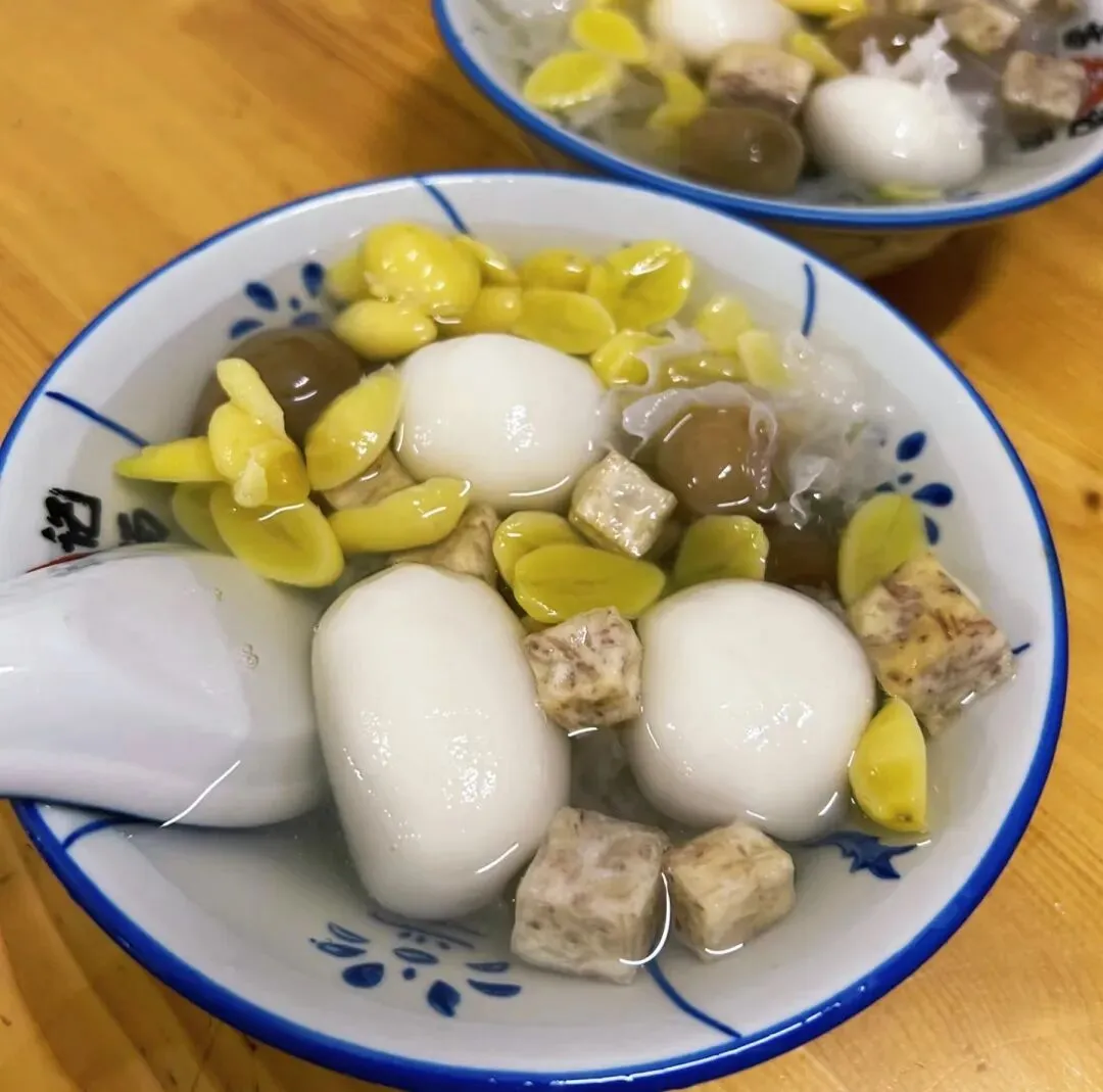 形似鸭子浮水的糯米汤圆,故而被形象地称为“鸭母捻”。传统鸭母捻有绿豆、红豆、芋泥、芝麻糖四种馅料。