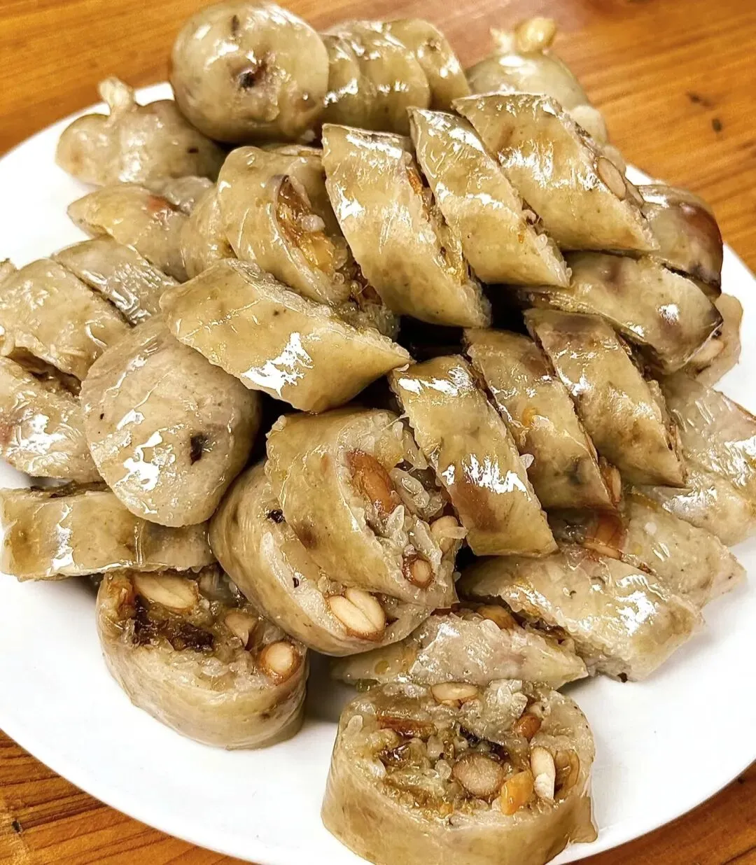 猪大肠灌入糯米、莲子、虾米等蒸熟,咸香软糯,风味独特。
