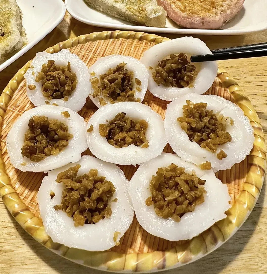 米浆蒸制成小碗状,中间放一撮咸菜脯(萝卜干),口感软韧咸香。