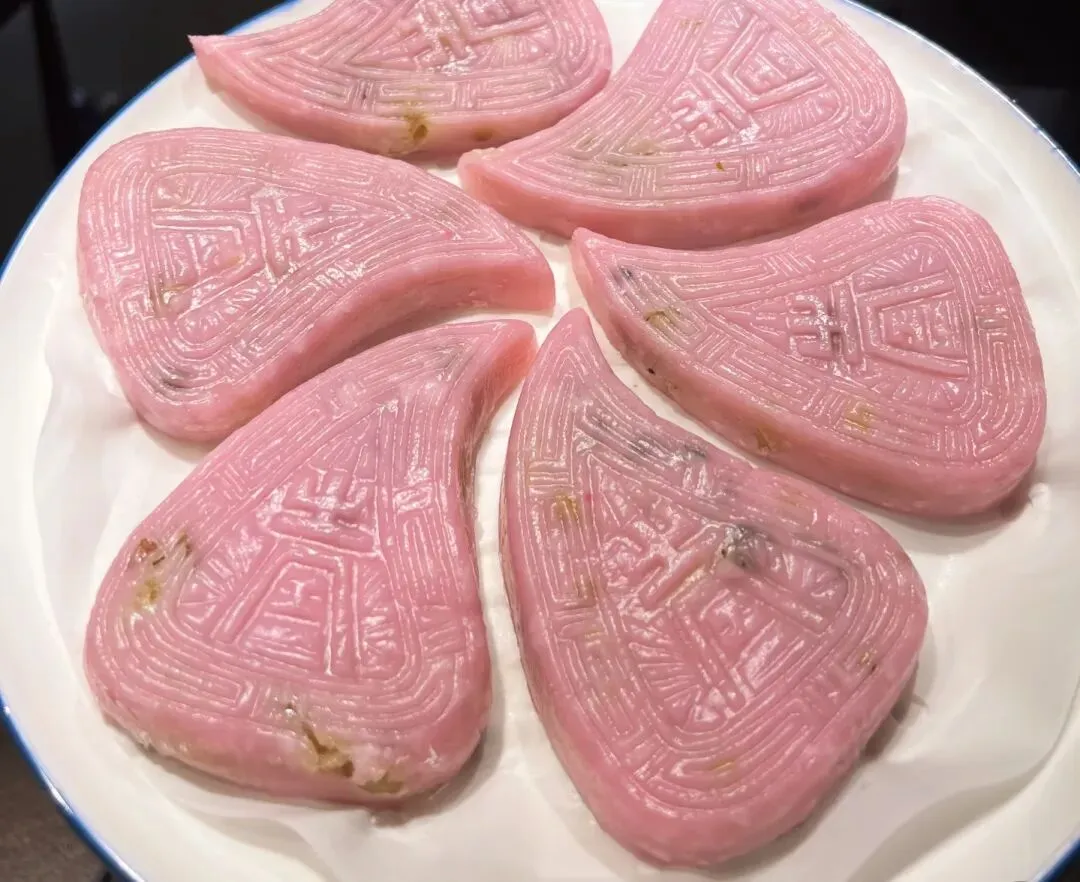 粿皮由大米加红米曲舂捣成粉红色粉末制成,包入糯米、香菇、虾米等馅料蒸熟,寓意吉祥。