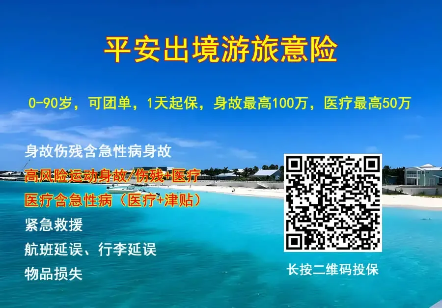 1、平安“畅享全球”旅行险:30天-90岁,个人/企业,可团单,承保境内旅游及出境游,支持人在境外投保、支持投保当天2小时生效,满足申根签证要求,覆盖留学、探亲、陪读、商务出行