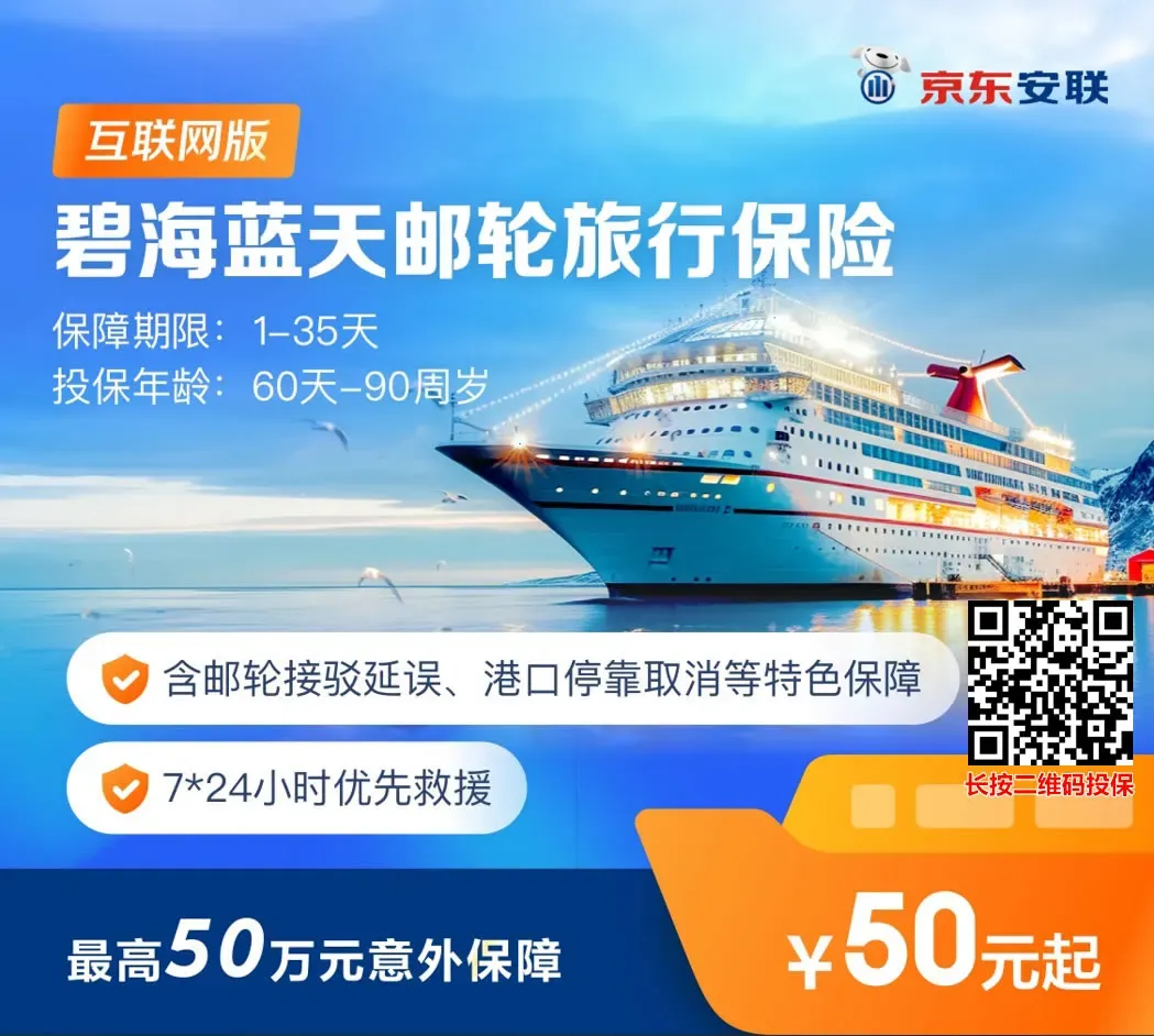 18、京东安联“碧海蓝天”邮轮旅行险:60天-90岁,1-35天,邮轮专享,6大特色保障,3个计划,最高人身50万医疗30万