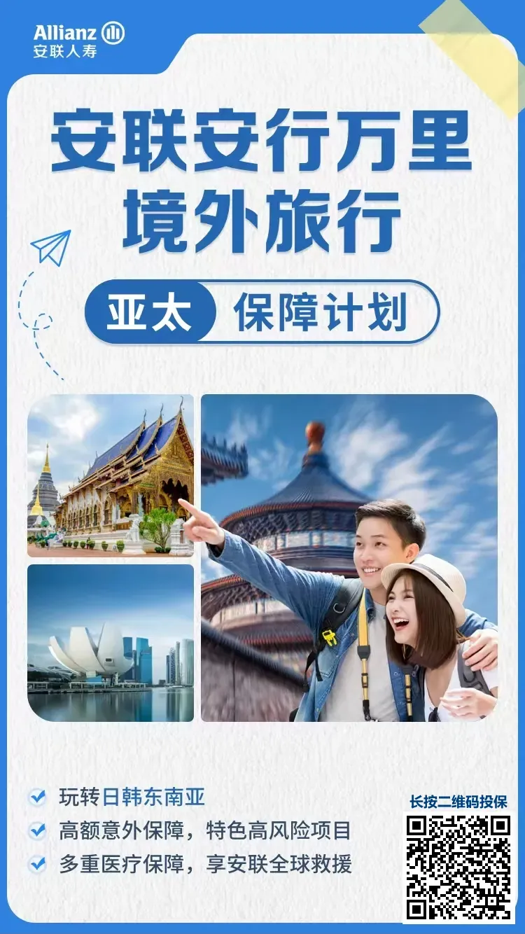 22、安联安行万里境外旅行亚太保障计划:60天-85岁可投,亚洲,3个计划,高额意外保障,特色高风险项目,多重医疗保障,全球救援