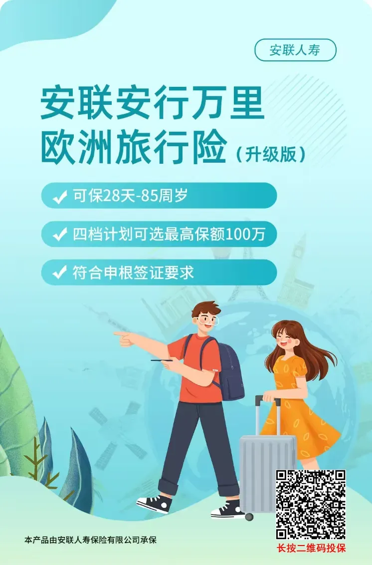 23、安联安行万里境外旅行欧洲保障计划:60天-85岁,欧洲,全面满足申根签证要求,境外住院、牙科、意外、门诊、高风险运动百万保障,支持单次出境最长365天,全球救援