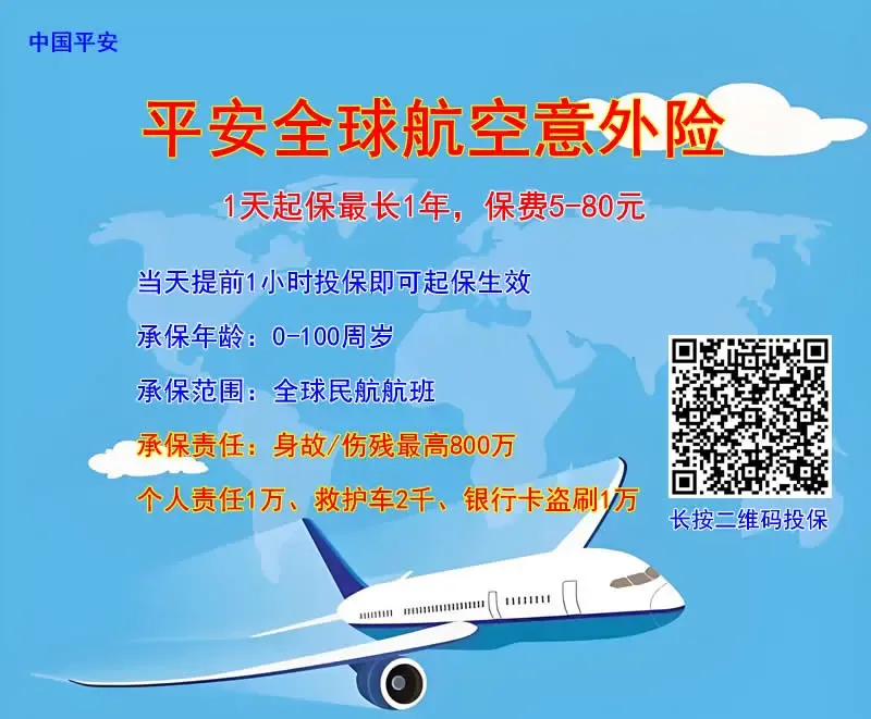 33、平安全球航空意外险:投保1小时生效,1天起保,保费5-80元,身故最高800万、个人责任1万、救护车2000元、银行卡盗刷1万