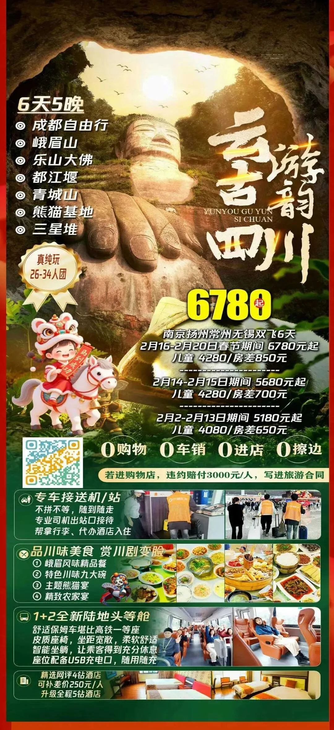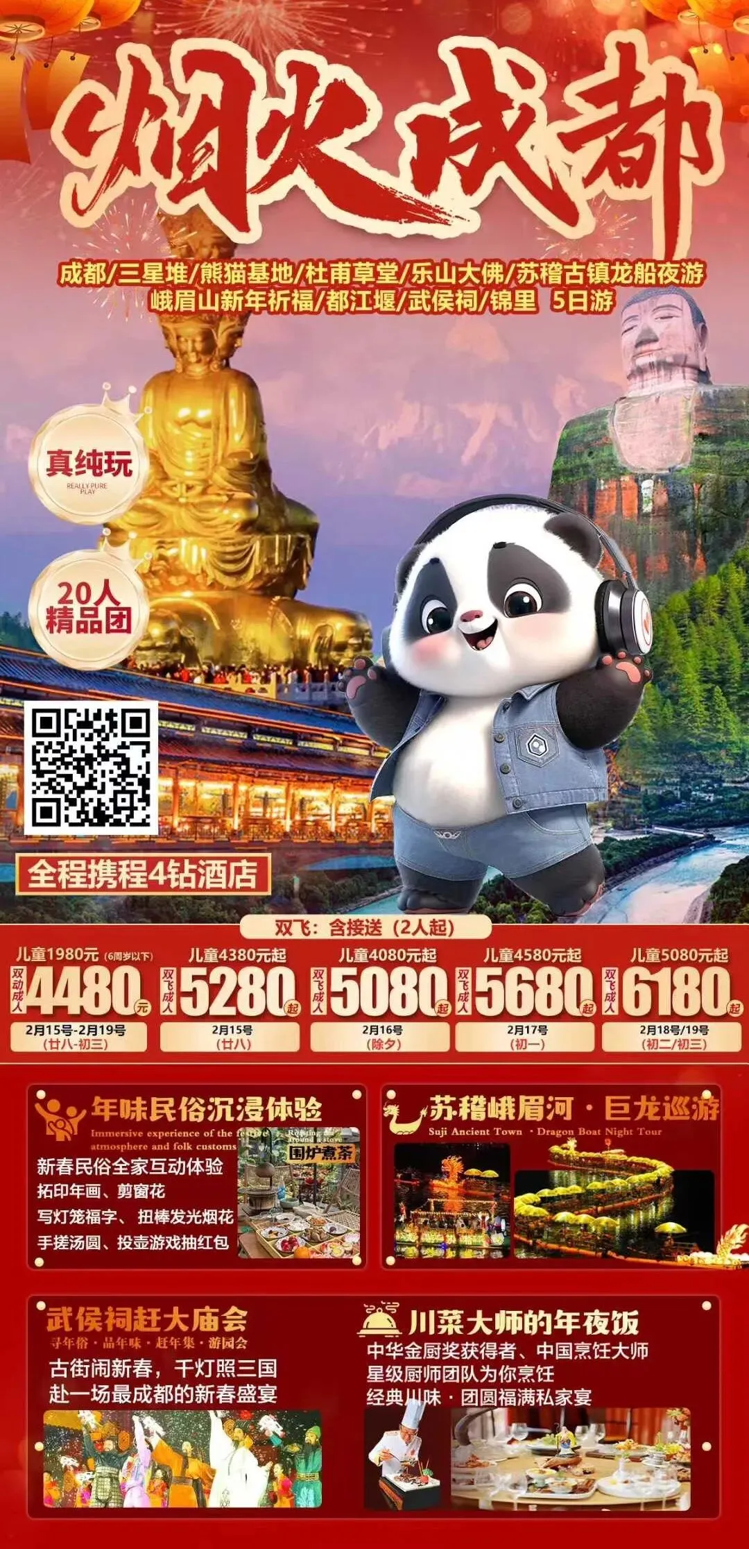 成都、三星堆、熊猫基地、杜甫草堂、乐山大佛、苏稽古镇龙船夜游、峨眉山新年祈福、都江堰、武侯祠、锦里5日游