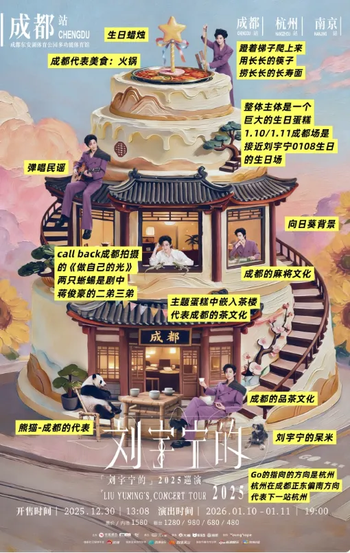 ▫️ 晚上:演唱会狂欢+刷视频回味·沉浸式共鸣初心 📍 有票粉丝现场体验:进入东安湖体育公园多功能体育馆(刘宇宁成都演唱会专属场地),在现场感受他扎实的唱功与真诚的舞台魅力——从OST金曲到原创作品,每一首歌都是他成长的印记;从风趣的舞台互动到走心的话语分享,每一个瞬间都能感受到他对粉丝的珍视、对舞台的敬畏。 👉 有票粉丝收尾时刻:演出结束后,刷着现场拍摄的视频、翻看打卡照片,回味这三天的追光时光。之后在馆外与同担告别,或在周边买份糖油果子、醪糟汤圆当夜宵,为追光之旅画上温暖的逗号。