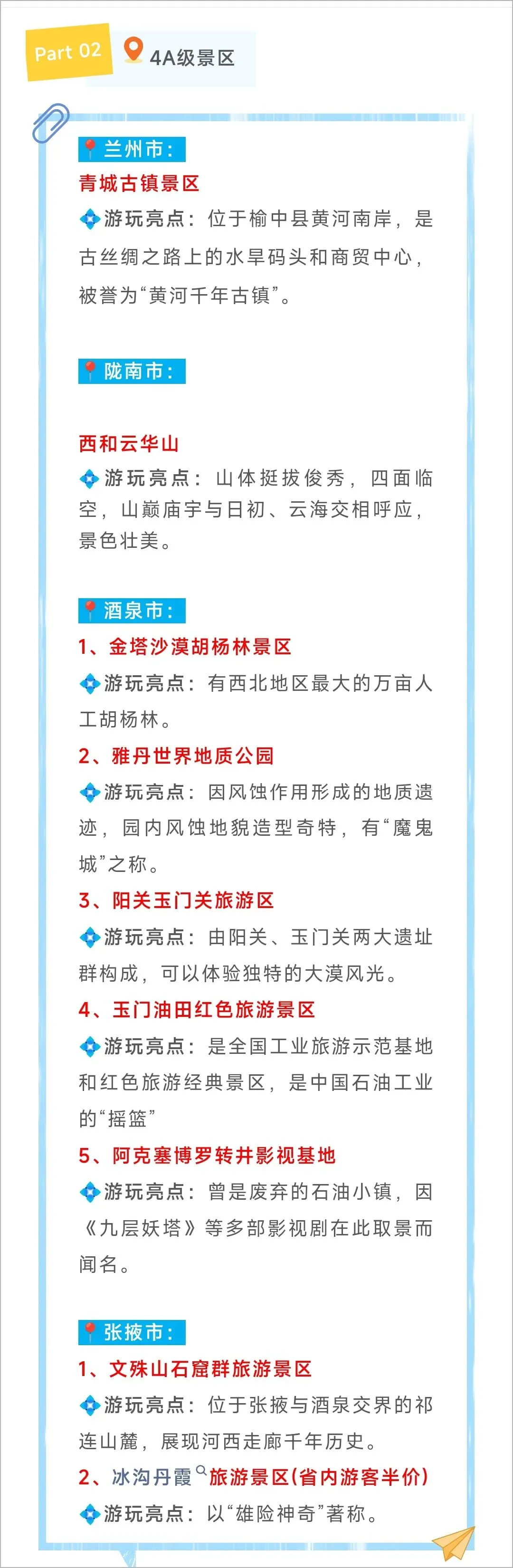 甘肃省2025—2026年冬春旅游优惠活动,几十个景区免门票、或者半价,其中包含了多个5A、4A景区,比如:鸣沙山月牙泉、嘉峪关景区门票半价。多数景区优惠到2026年3月31日截止。
